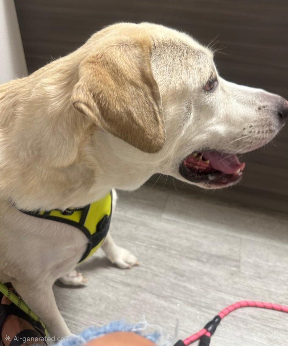 Skye is a joyful Labrador born in January 2020 with a look you won’t forget—one blue eye, one brown eye, and an adorable nub tail she was born with. When Skye gets excited, her whole body wiggles (yes, the whole thing), and it’s impossible not to smile.