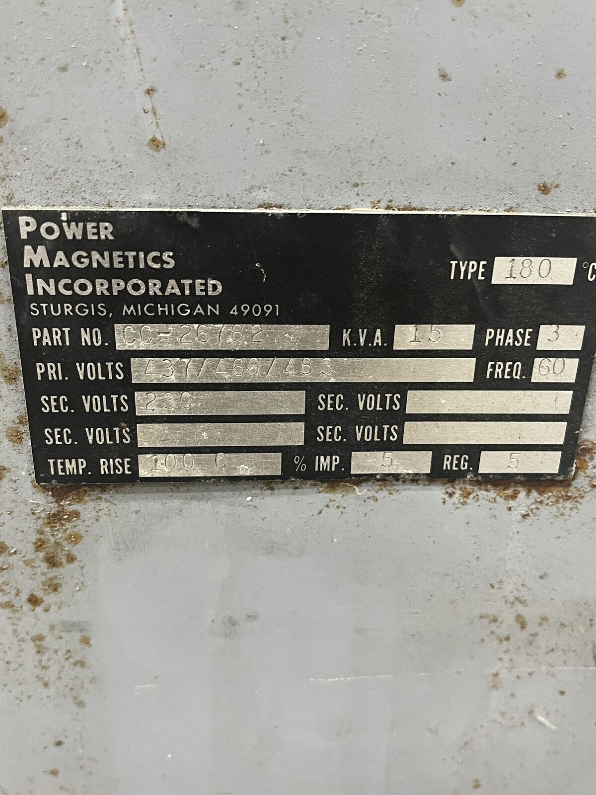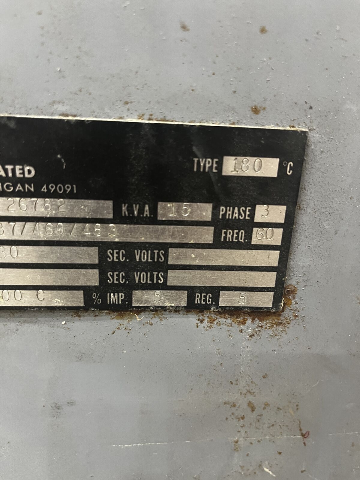 Specs: -15 KVA -3 Phase -60 hz -Pri Volts 437/460/483 -Sec Volts 230