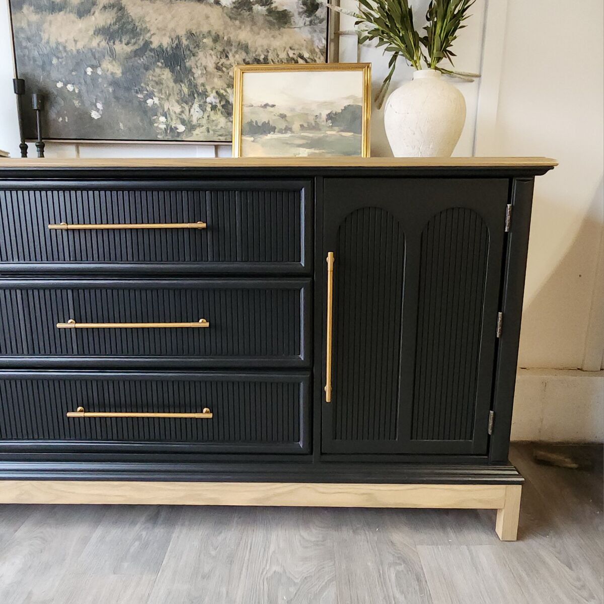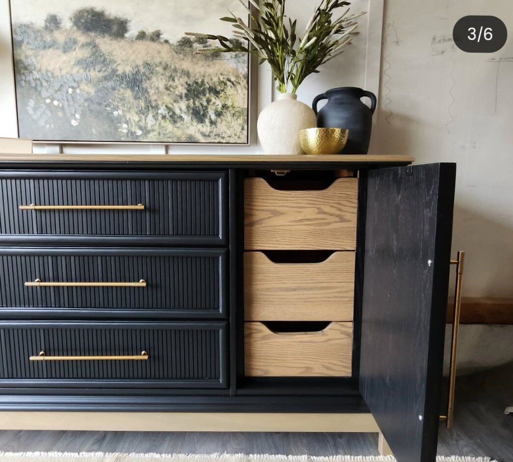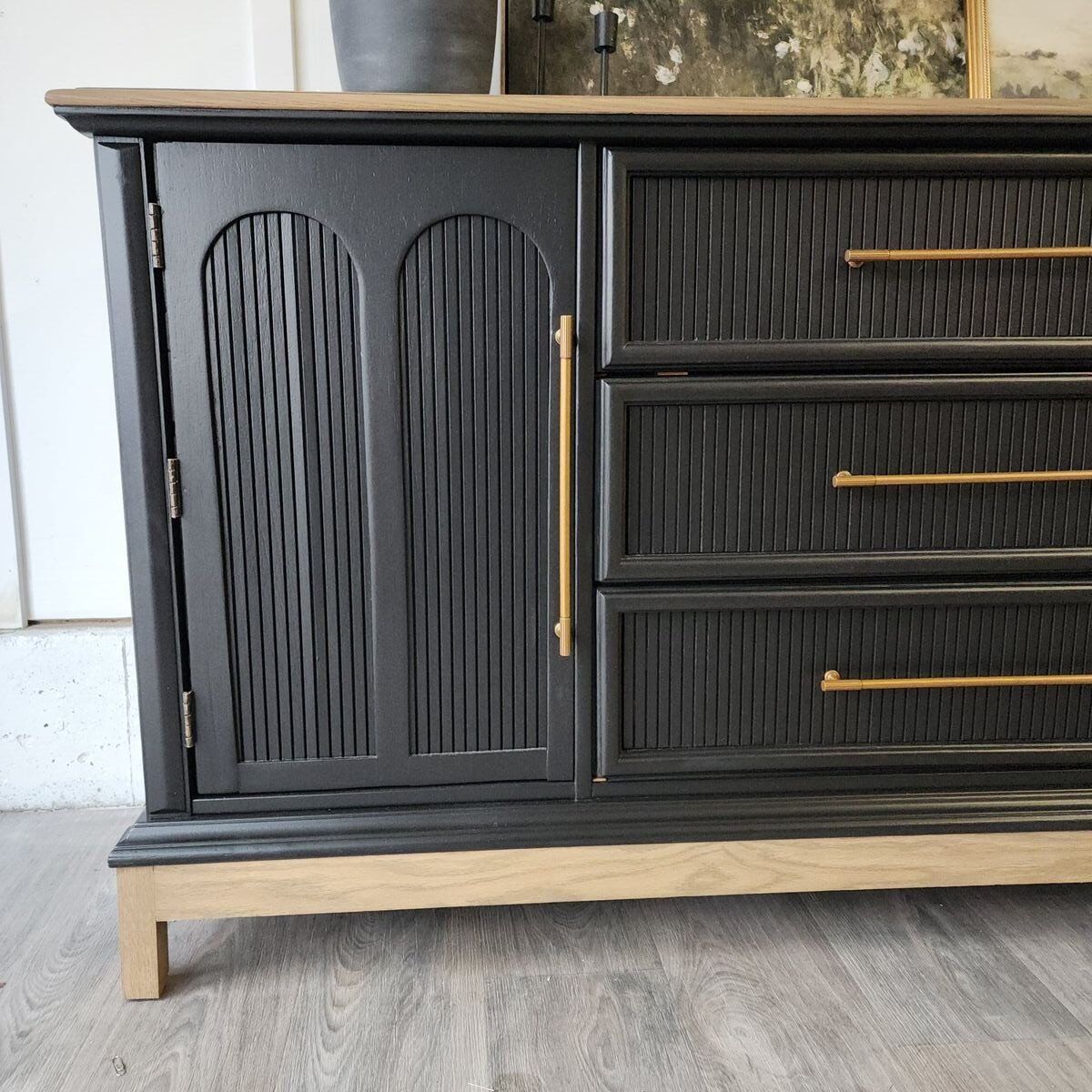 VenmoBeautiful solid wood Bassett dresser featuring nine dovetail drawers, all sliding smoothly. This is an original vintage Bassett piece that has been professionally refinished and modernized with a custom base,arched door design and updated hardware, making it both timeless and functional.