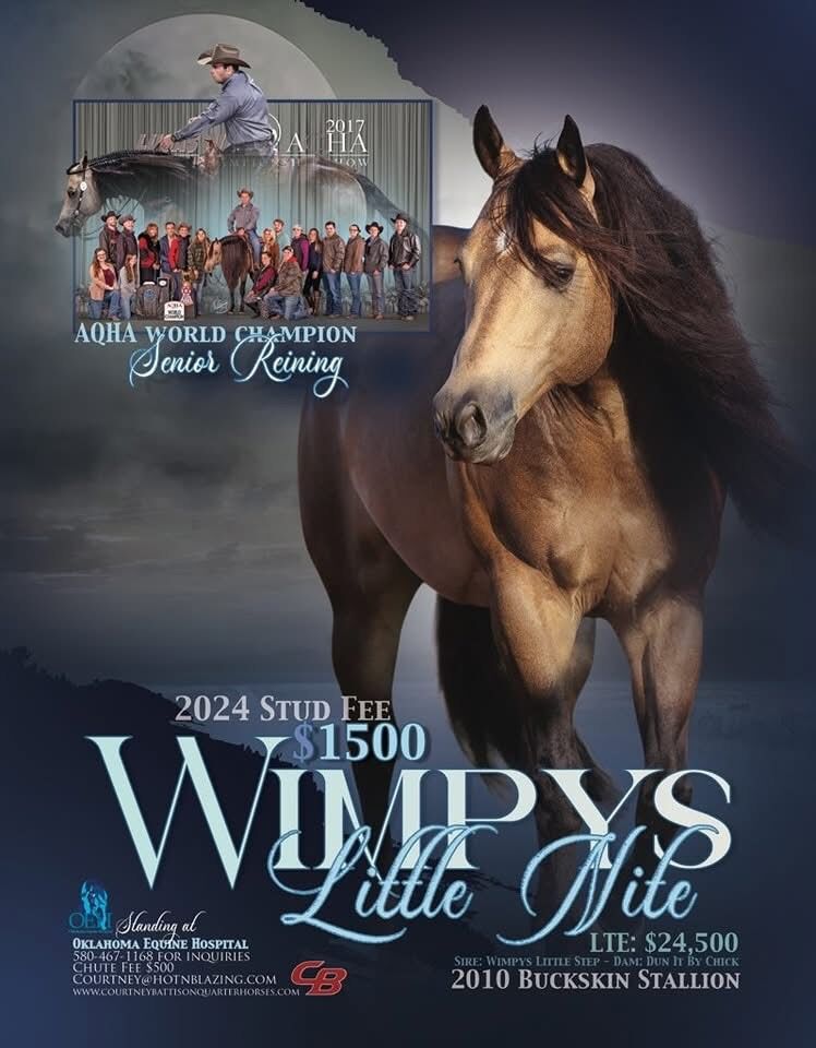 ZelleWimpys Little Nite is an AQHA buckskin stallion who has proven himself at the highest levels of reining competition, most notably earning the 2017 AQHA World Champion title in Level 3 Senior Reining, along with multiple NRHA and NRBC placings and AQHA performance honors. Sired by the legendary Wimpys Little Step, one of the most influential reining sires of all time, he carries elite, proven bloodlines known for producing athleticism, trainability, and longevity in the show pen. His own success in the arena confirms that he not only has the pedigree but also the ability to perform under pressure. He carries influential bloodlines through Wimpys Little Step, whose progeny have dominated reining classes and earned significant accolades.  Because of that combination of elite performance and proven genetics, he is considered a valuable breeding stallion for anyone aiming to produce foals with reining ability, competitive potential, and market appeal.