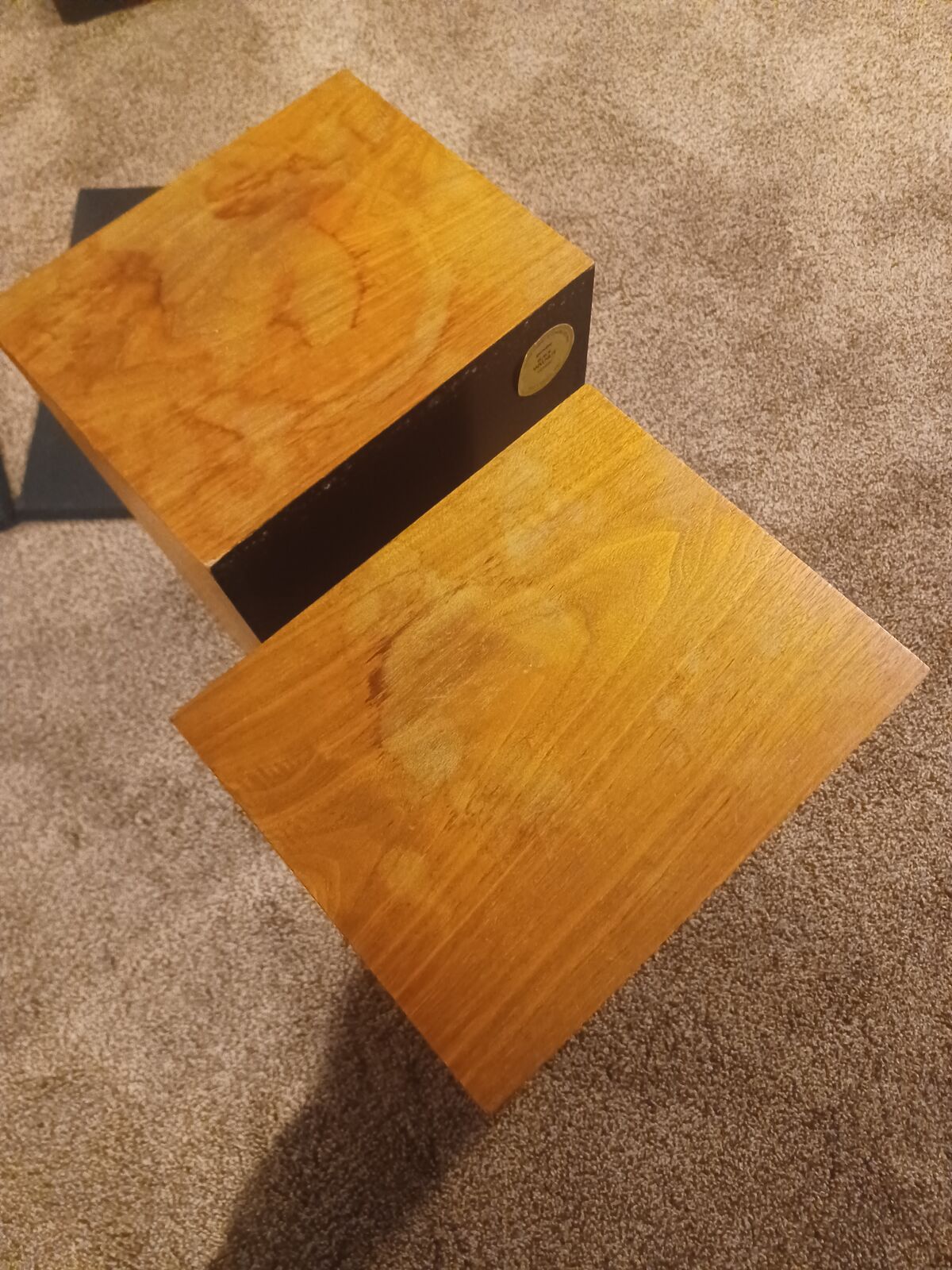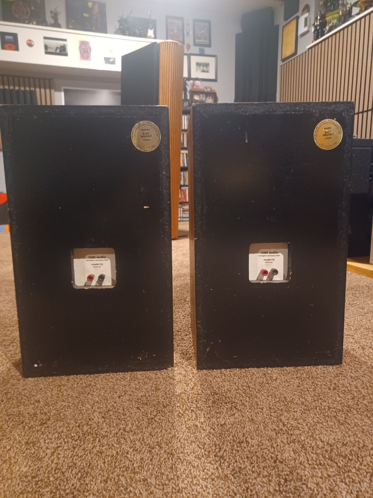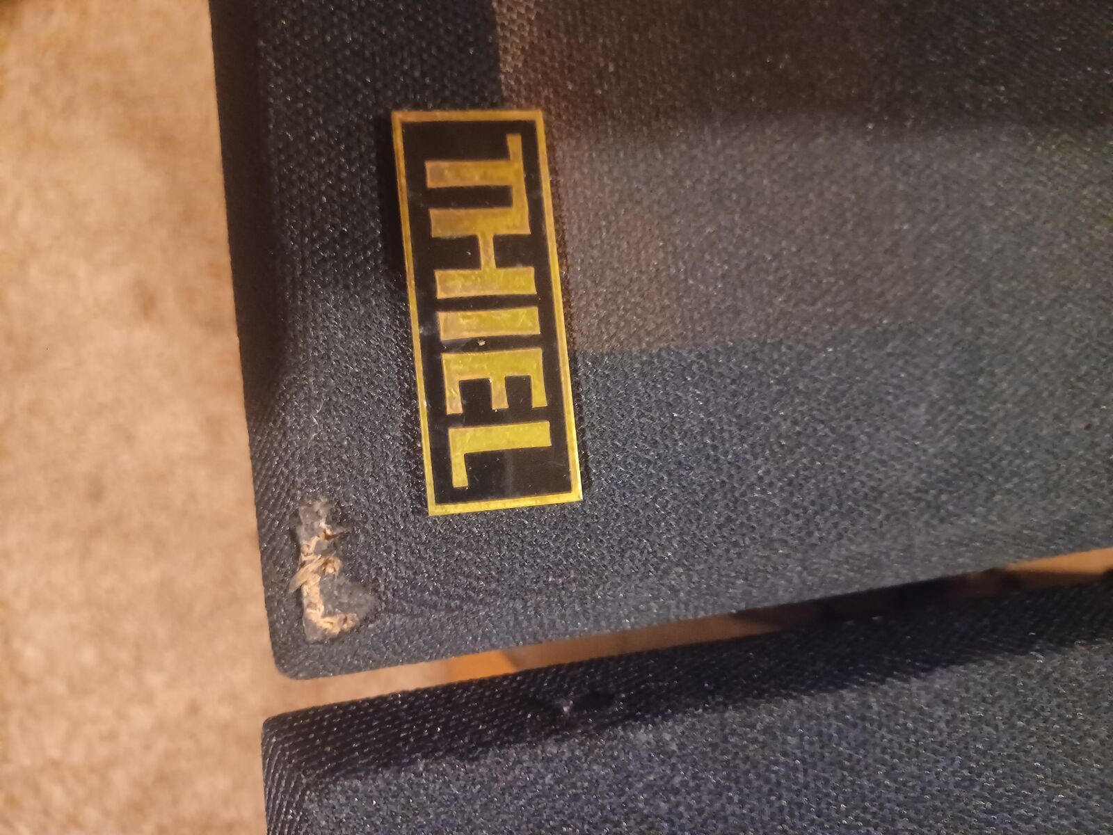 Pair of Thiel speakers. Model 02. Very early examples from Hi-End speaker manufacture Thiel. Sound fantastic and have a great soundstage. Woofers have rubber surrounds, so no worry about the rot you get with the foam surrounds. Black walnut cabinets. Top of speakers have stains. The rest of the cabinets look good. One grill cover has some damage to the cloth.