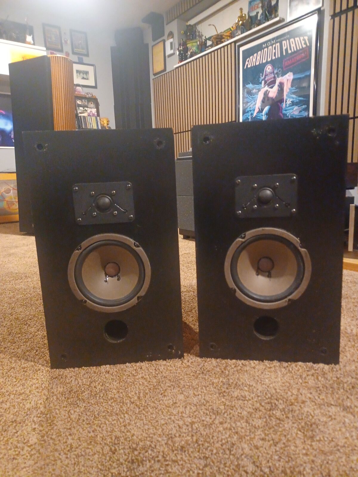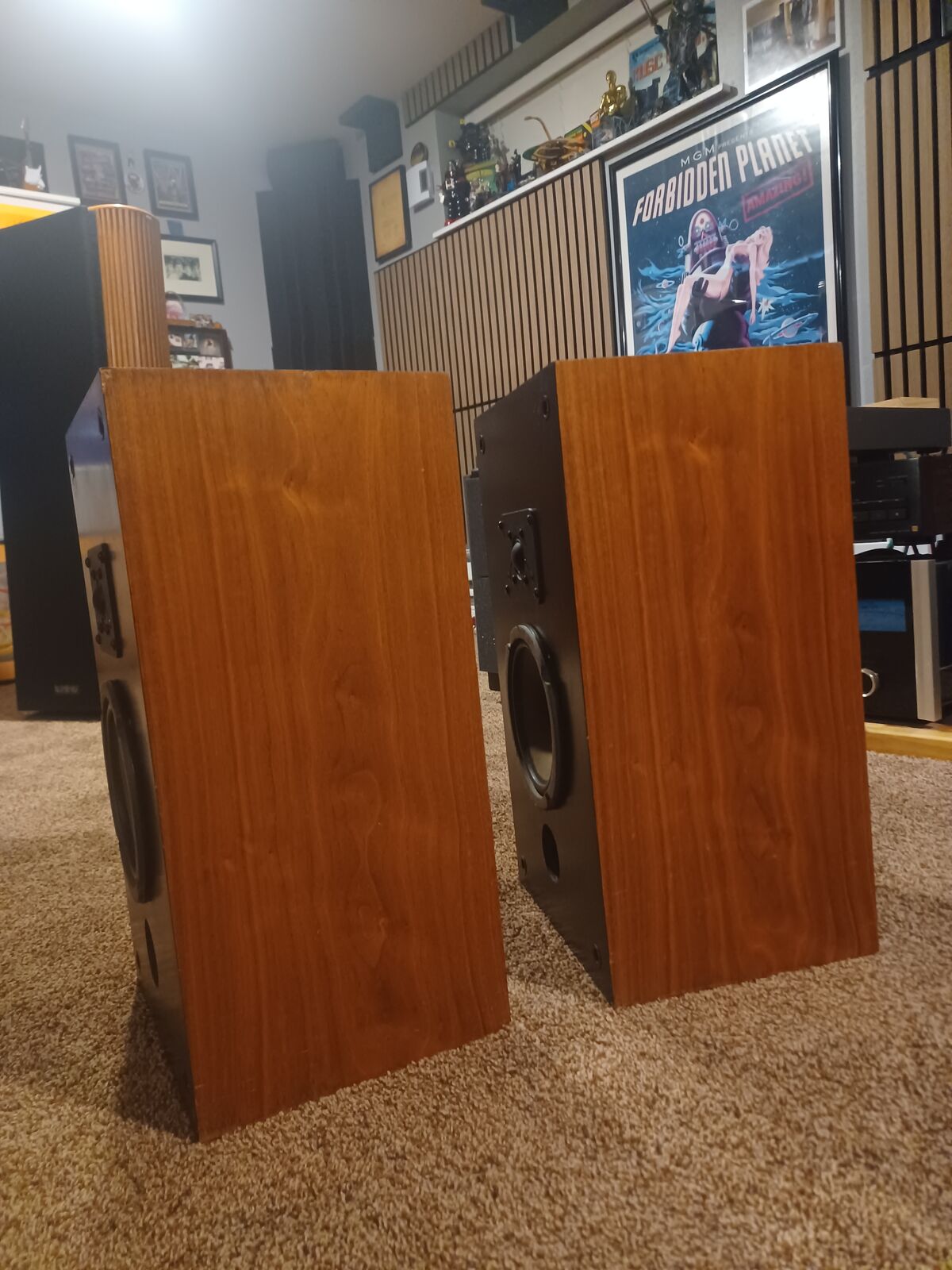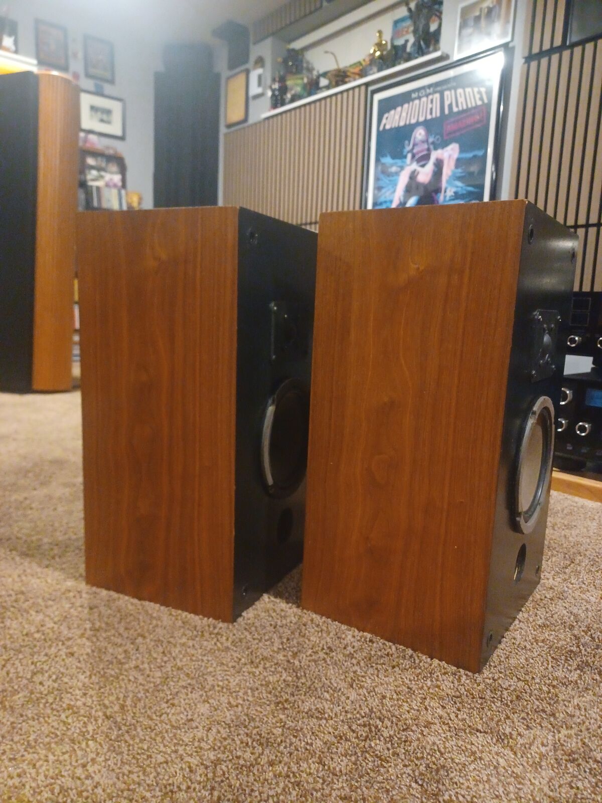 Pair of Thiel speakers. Model 02. Very early examples from Hi-End speaker manufacture Thiel. Sound fantastic and have a great soundstage. Woofers have rubber surrounds, so no worry about the rot you get with the foam surrounds. Black walnut cabinets. Top of speakers have stains. The rest of the cabinets look good. One grill cover has some damage to the cloth.