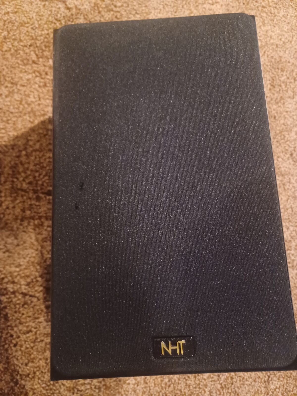 Pair of NHT model 1.1 speakers. New foam surrounds installed. cabinets in good condition. One of the connectors "Pos" is missing the plastic knob used to tighten down the speaker wire. Not an issue if using banana plugs. one grill has some small tears.