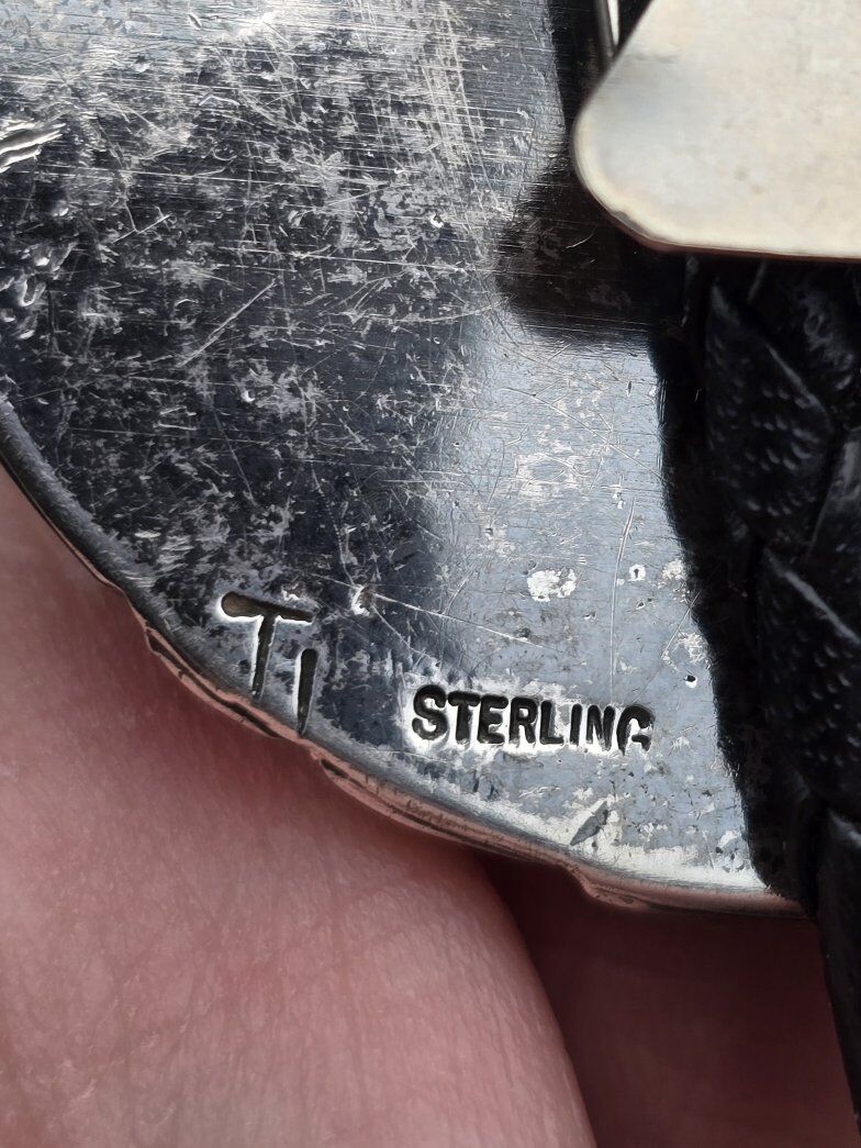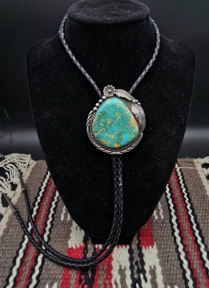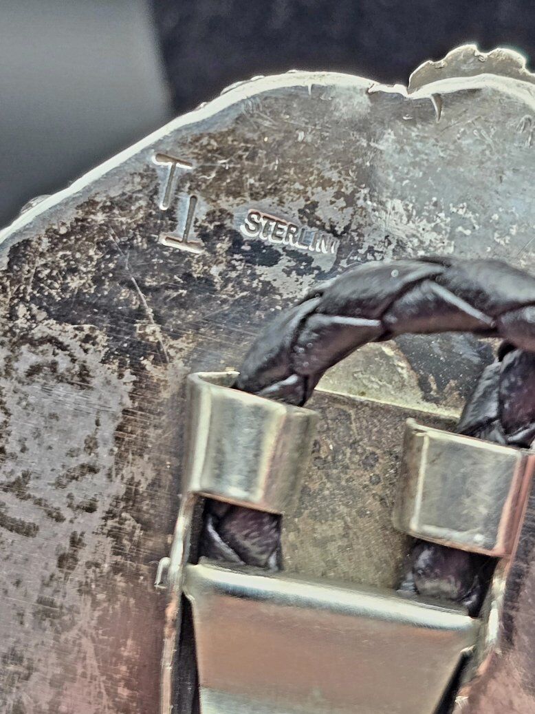 VenmoMan oh man, who doesn't love Royston Turquoise?? This particular piece of it is gem quality, and has a gorgeous brown matrix in between those milky blue spots. The turquoise is set in sterling silver, with a sterling silver feather accenting the top. Signed "TT Sterling", and with vigorous research my team was only able to find this signature on vintage pieces, but couldn't find a record of the official name of the artist. If you're ready for compliments.. this bolo is for you!
