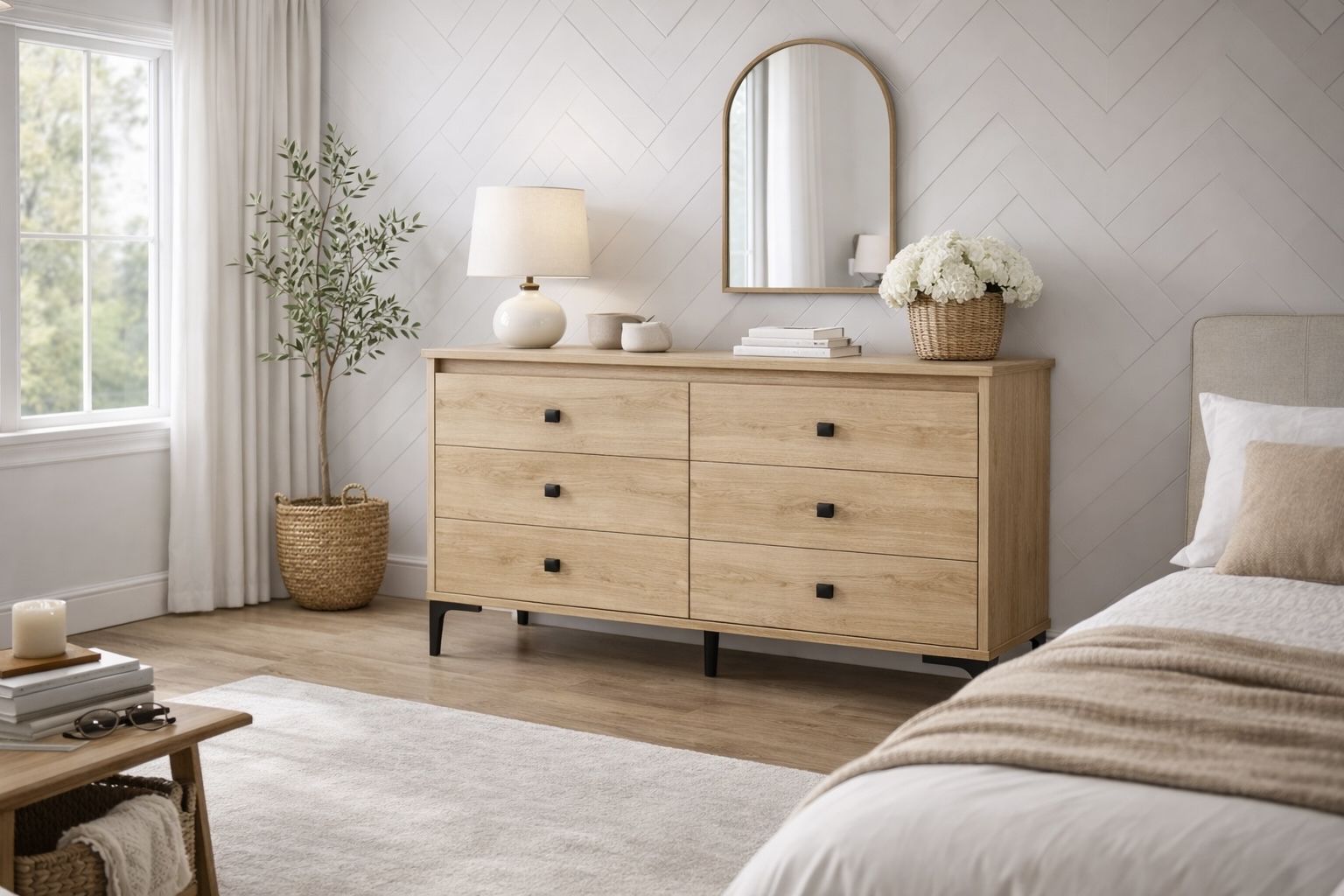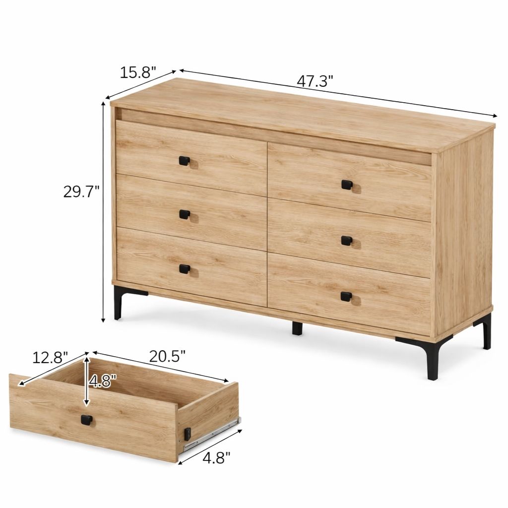 Stylish dresser with six big drawers. Light wood veneer finish and black metal legs & knobs. Great for bedroom storage. Measures 47.3 inches wide, 15.7 inches deep, 29.7 inches tall. Drawers are 20.5 inches wide, 12.8 inches deep, 4.8 inches high. Top has 160 pounds capacity, each drawer has 35 pounds capacity