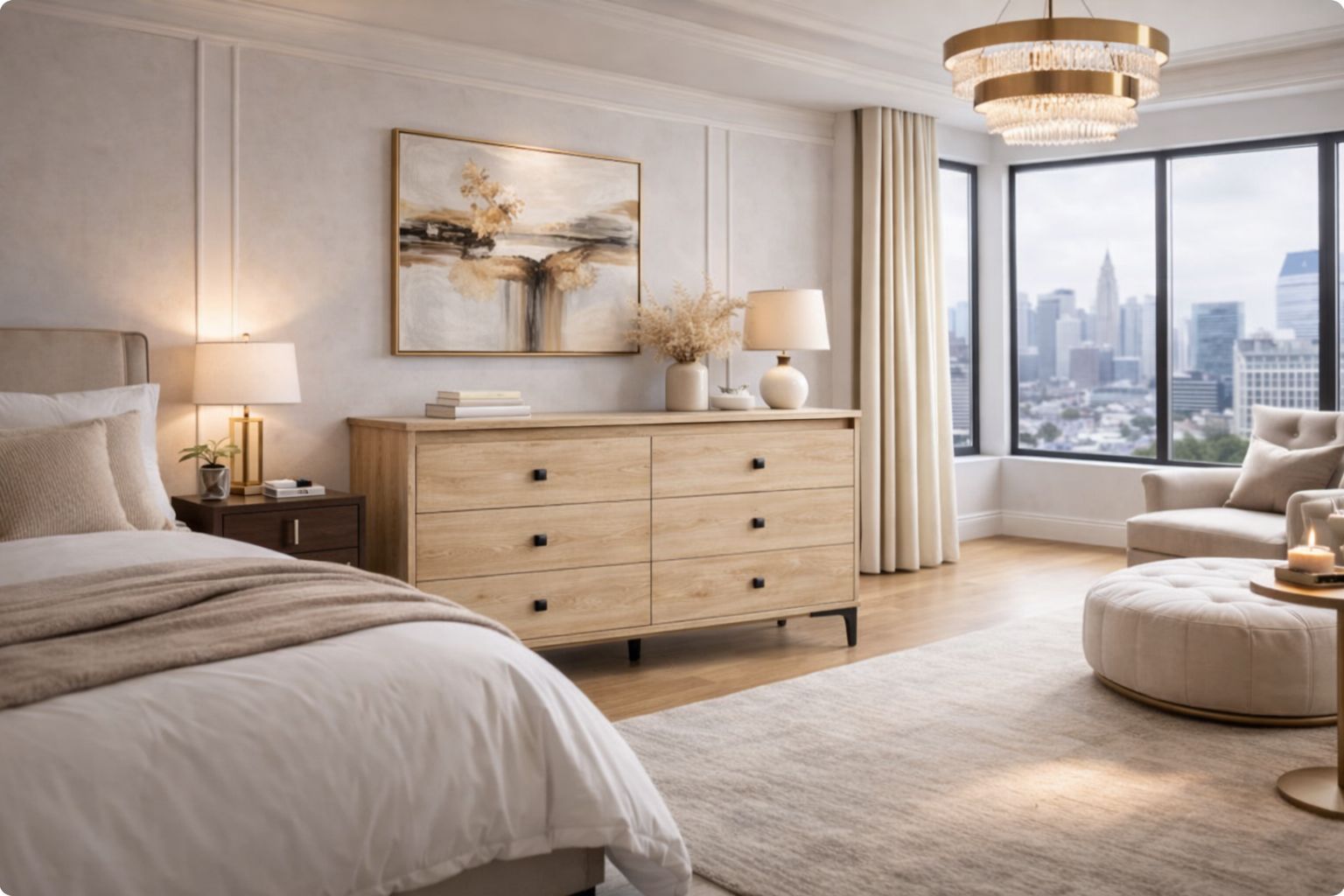 BRAND NEW IN BOX: 6-Drawer mid-century modern dresser with light wood veneer & black iron legs, and knobs