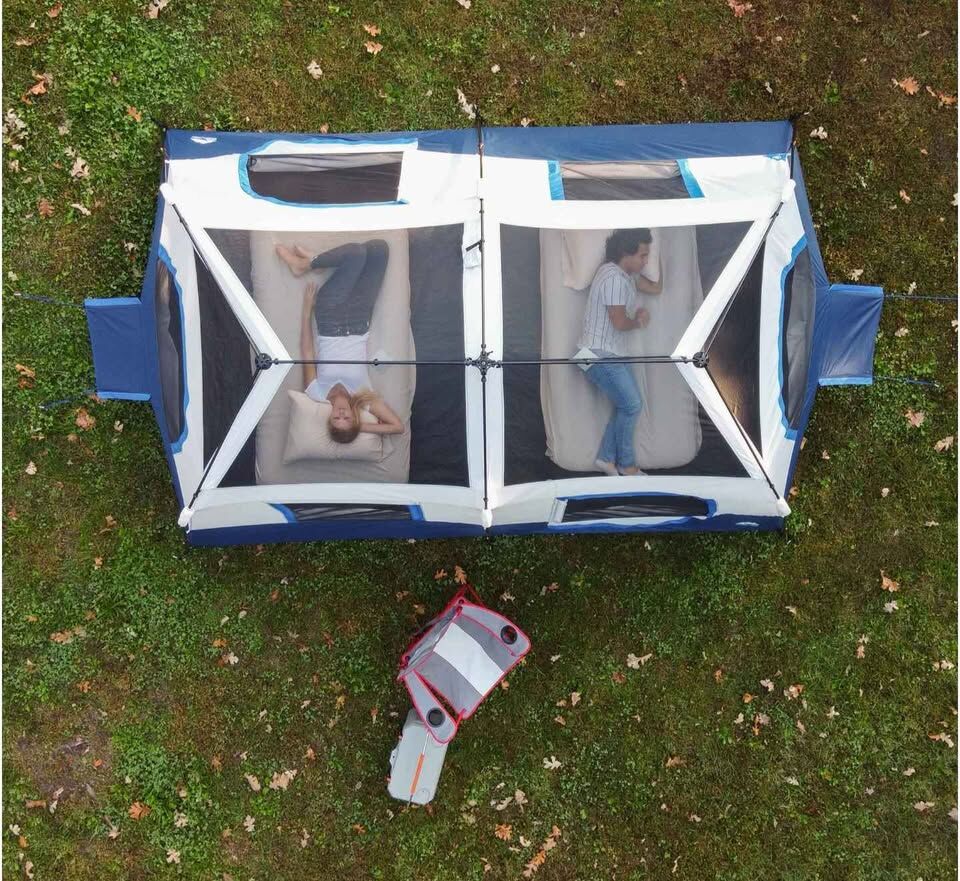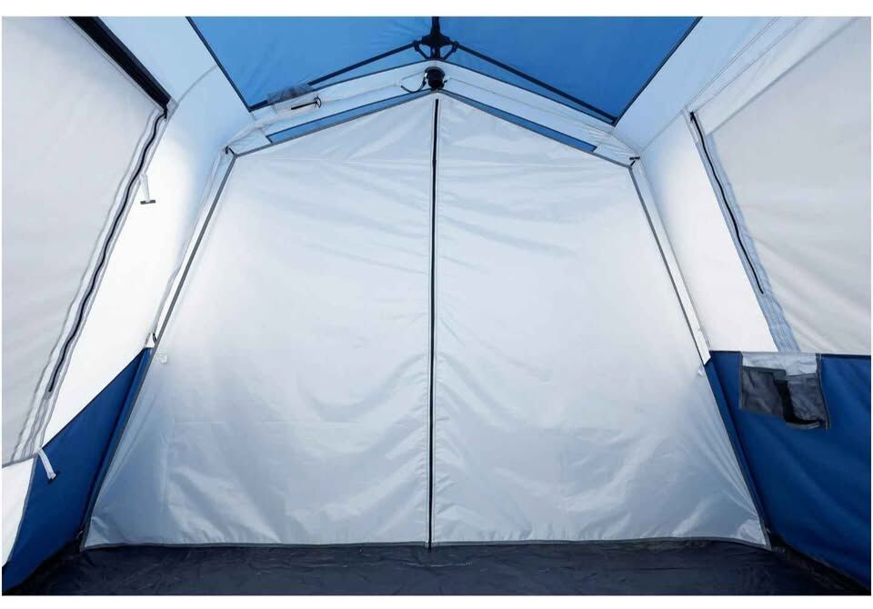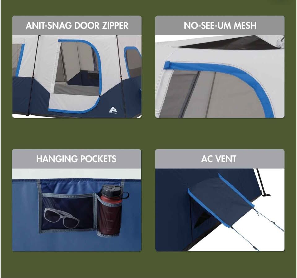 Pre-attached poles for easy 2-minute setup Includes six mesh windows, two adjustable AC vents, a removable room divider, and one electrical port Spacious interior cabin design with extra headroom Mesh storage pocket for storing smaller items like a wallet or sunglasses Includes a removable rainfly Carry bag included for easy transportation to and from the campsite 1,200 mm PU water-resistant coating Dimensions: 13' x 9' x 72" (H)