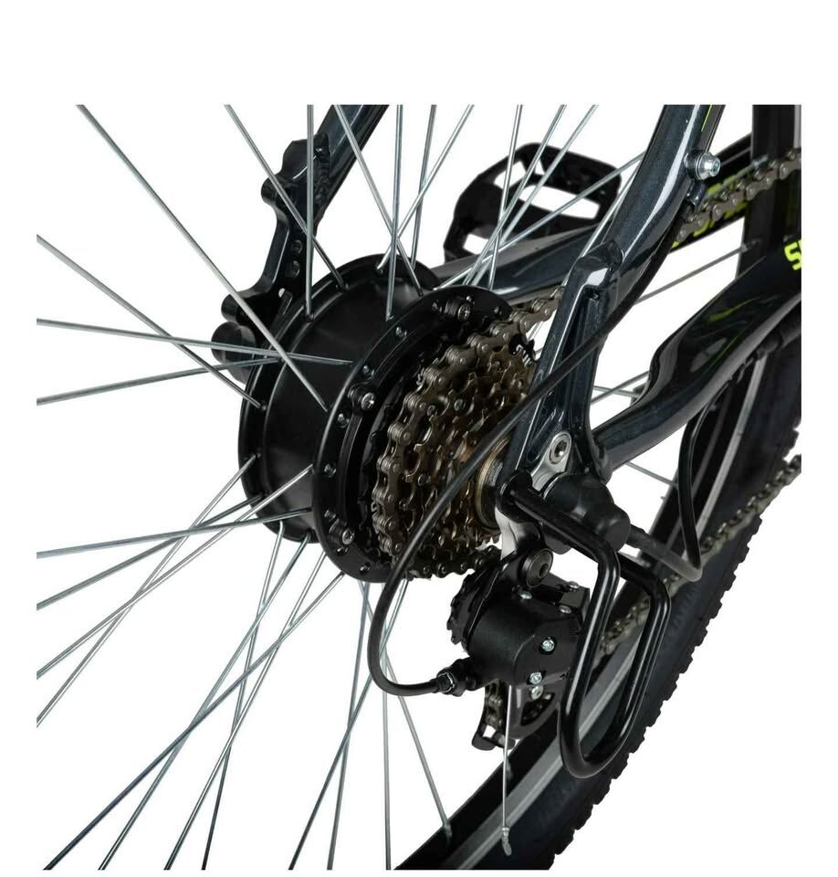 26in lightweight aluminum frame Rear hub brush-less 36V / 250W< electric motor Integrated flush-Mount 36V / 7.8 AH battery Battery charging time of 4 hours Top Speed at 20 MPH with a run time of 1 hour / 20 Miles 6 Speed Shimano Grip Shifter / Shimano Rear Derailleur Front suspension forks Front and rear v-brakes 48-spoke alloy rims Three piece cranks Rider max weight : 275 lbs.