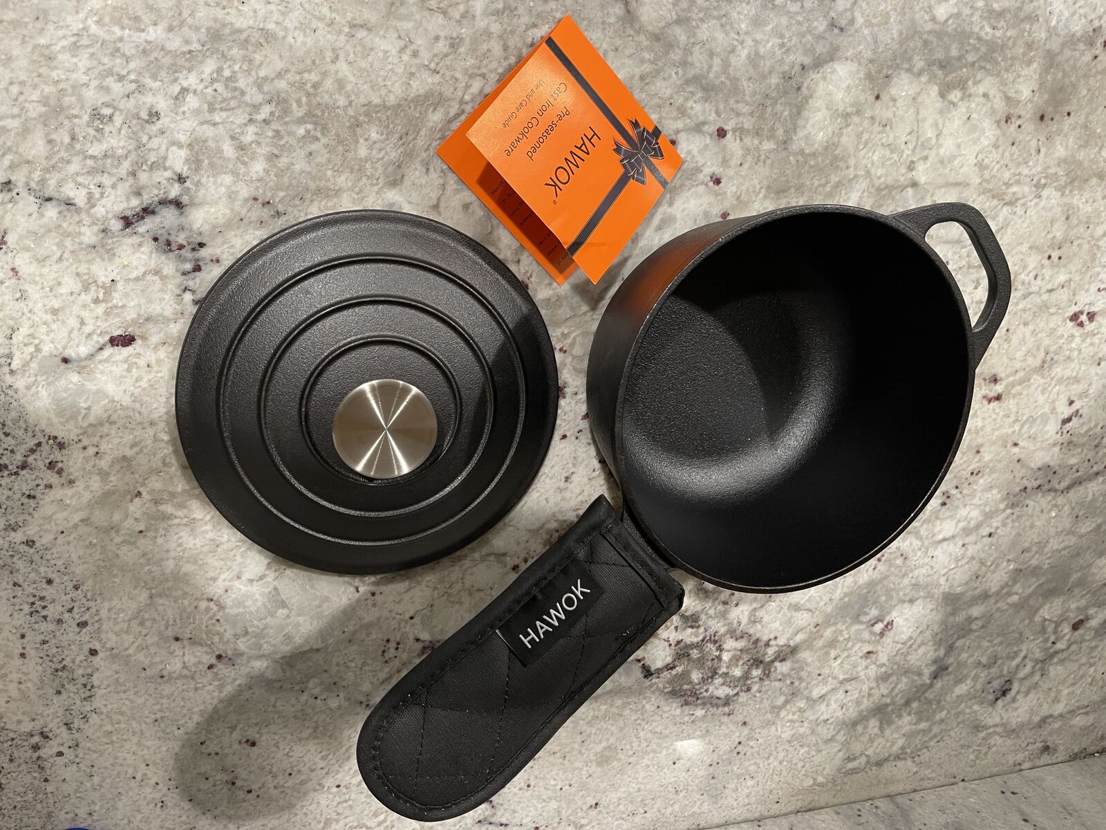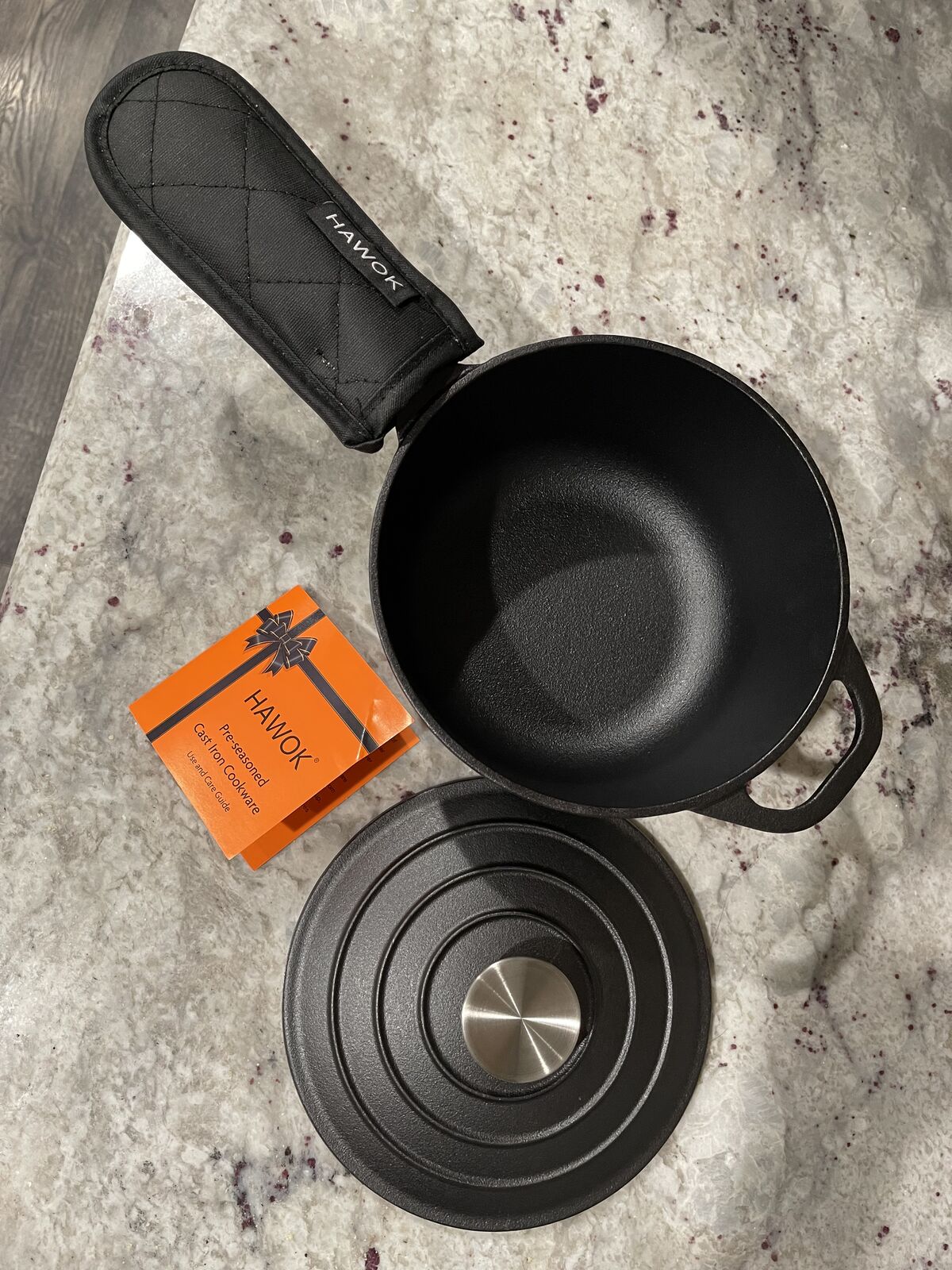 VenmoMaterial: Cast Iron Finish Type: Pre seasoned Brand: HAWOK Color: Black Capacity: 3.5 Quarts Product Dimensions: 8Diameter x 4 Deep x 5 long handle