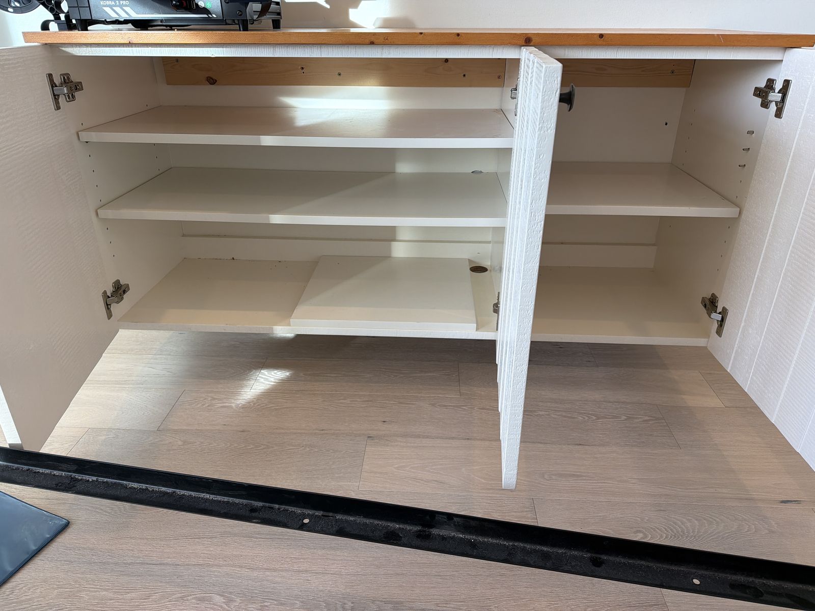 VenmoThis is a great, sturdy floating cabinet. Originally from west elm. The top piece is solid wood. It has Three doors with shelving inside. The cabinet pictured on the right has one more shelf that can be inserted. 54” W x 18.25” D x 24.5” H Thanks