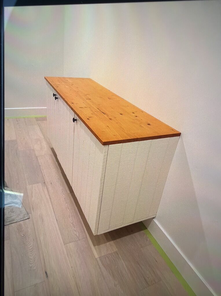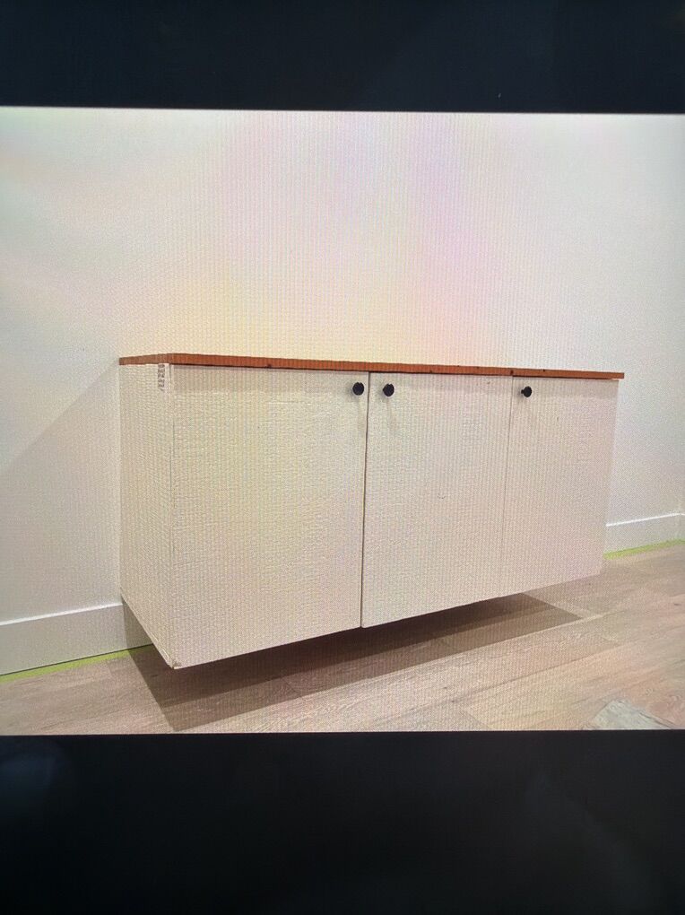 VenmoThis is a great, sturdy floating cabinet. Originally from west elm. The top piece is solid wood. It has Three doors with shelving inside. 54” W x 18.25” D x 24.5” H Thanks