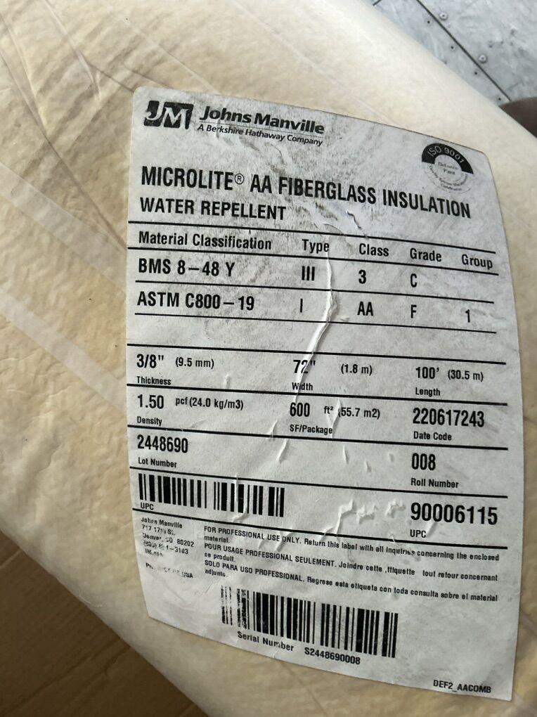 ApplePayFull roll of Johns Manville MICROLITE® AA fiberglass blanket insulation with water-repellent binder. This is commercial/specialty insulation (often used for thermal/acoustic applications and specialty builds), not standard “pink batts.”