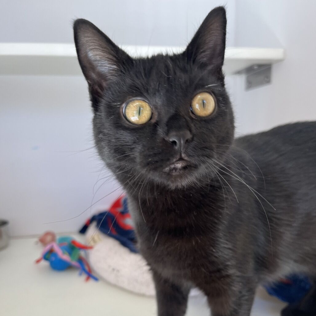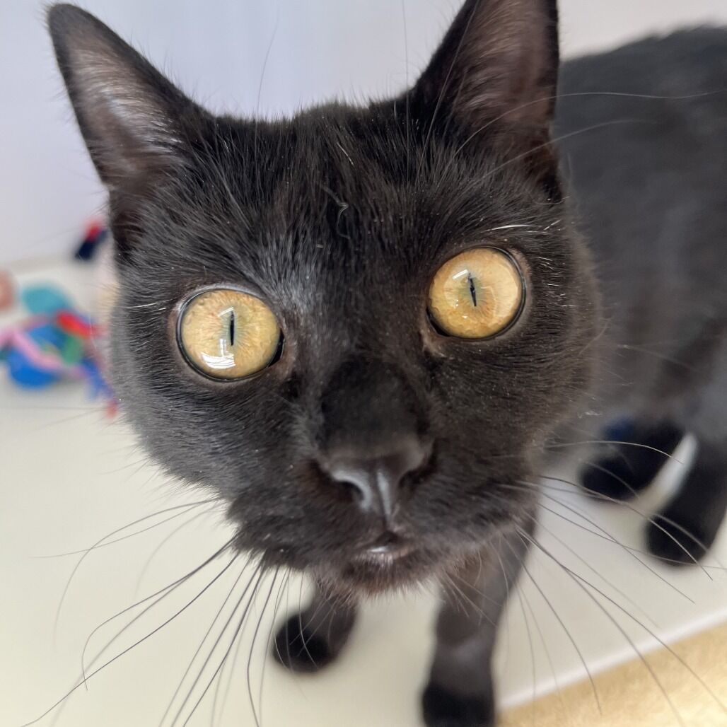 Ditto is a sleek black cat with big, bright eyes that are always full of curiosity. This girl is wonderfully well-socialized and absolutely loves being around her people. If you’re looking for a cat who will keep you company and make sure you’re never alone, Ditto is your girl!