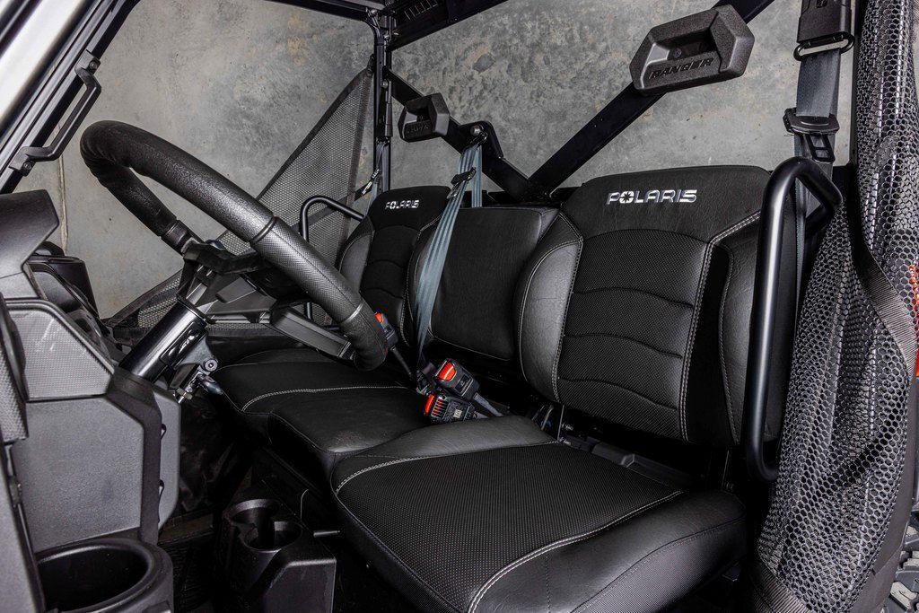 Ride more comfortably from sunup to sundown, thanks to a tilt steering wheel, contoured seats with back bolsters and a factory-installed roof. Redesigned cab nets offer one-handed operation for easier entry and exit.