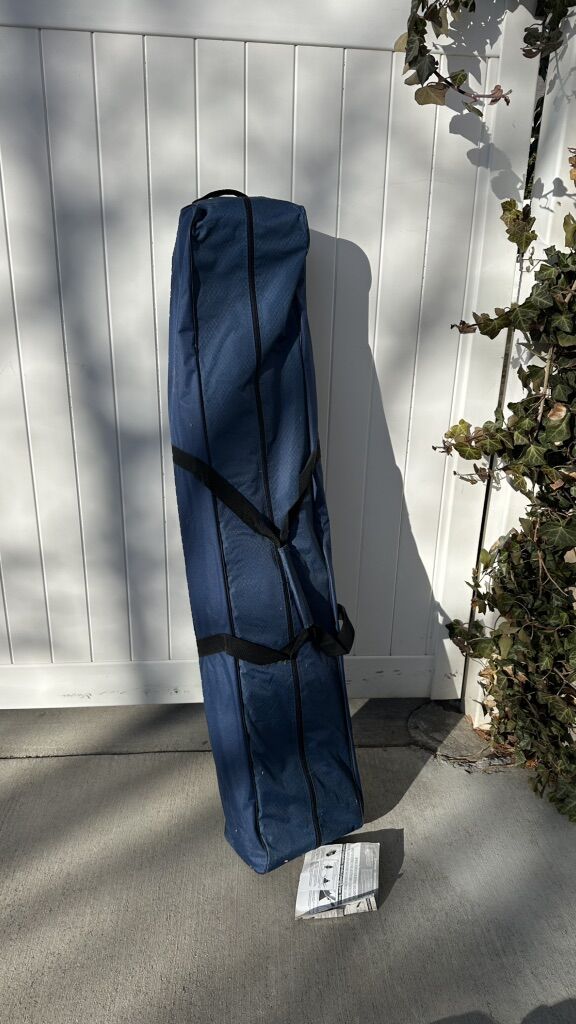 Features: Color: blue / gray Foldable frame for easy transport Removable sun protection canopy Mesh net below hammock for light storage use Pillow, canopy poles, stand and wheeled carry bag included