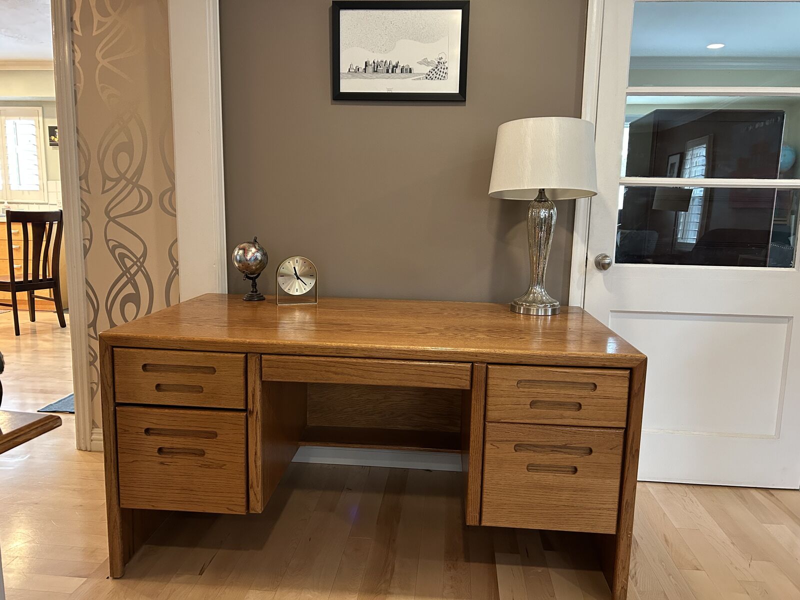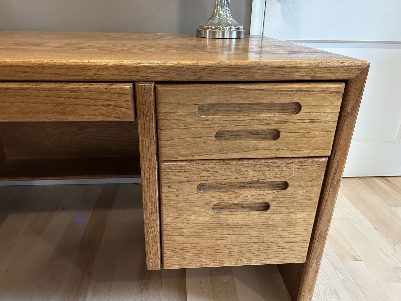 VenmoThis is a very solid five-drawer desk. Measures 60" wide, 31" deep, and 30" high. The bottom two drawers are designed to hold letter or legal-size file folders. This is heavy, and will require at least two people to move, and a truck/van/SUV/etc. to take. Pickup only.