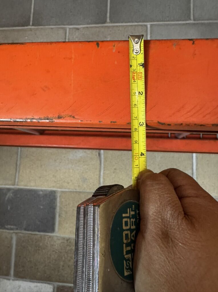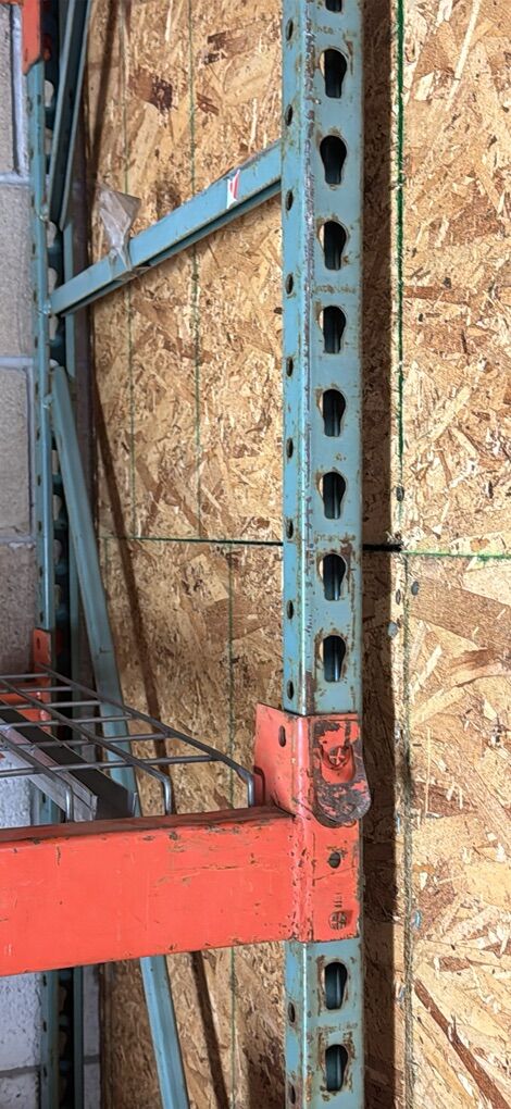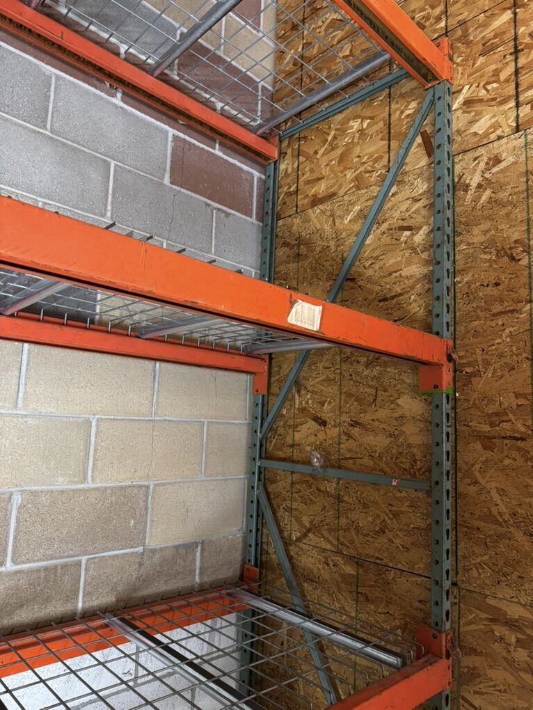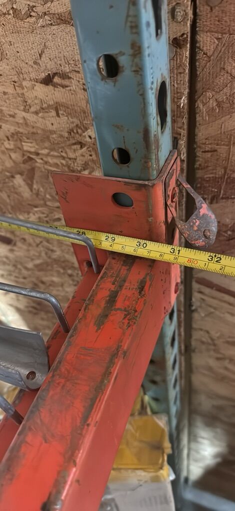 10’Hx 100” Wx30”D from outside to outside of rack. Beams are 3” thick. 10’Hx 100” Wx30”D from outside to outside of rack. Beams are 3” thick. Pallet rack shelving with wire decking. In sturdy holding shape. It held heavy automotive items in a storage unit. *Bring your own soft hammer to take apart and a utility trailer to haul. It takes about 20 minutes to take apart.