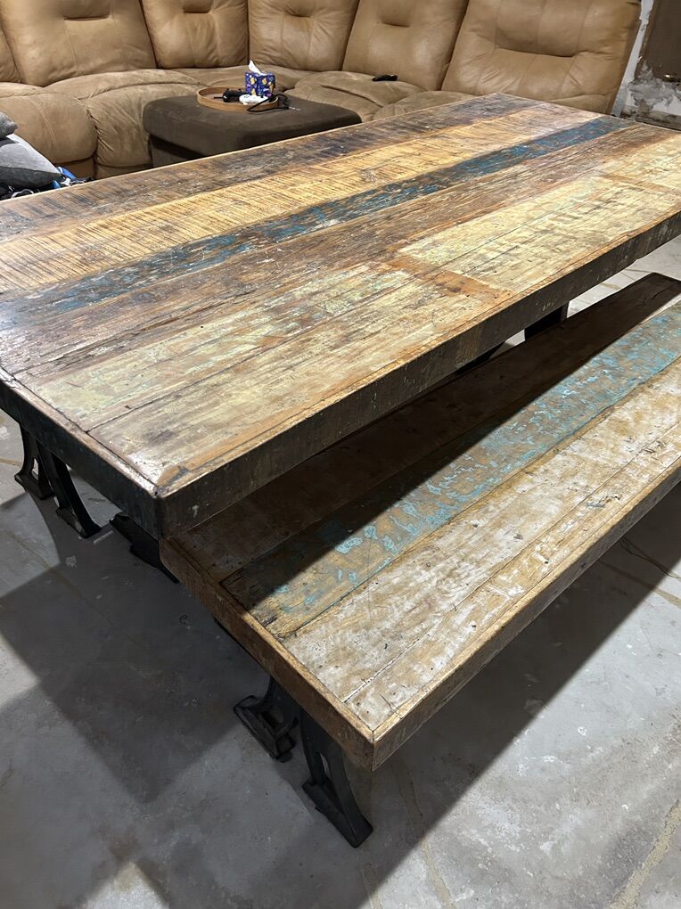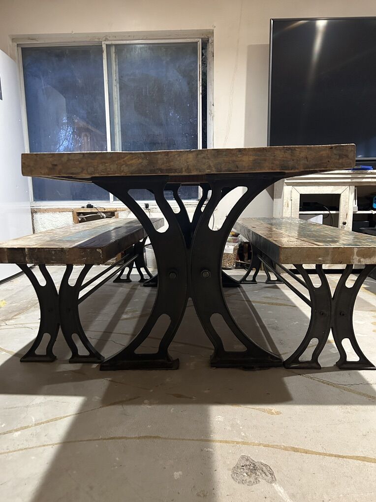 We love this cool conversation starter dining set. We ordered it from RC Willey it is SO sturdy with the heavy duty wrought iron legs. And “distressed” / “weathered” style top is so cool with the look of old worn paint and stuff. Just love this whole set!!