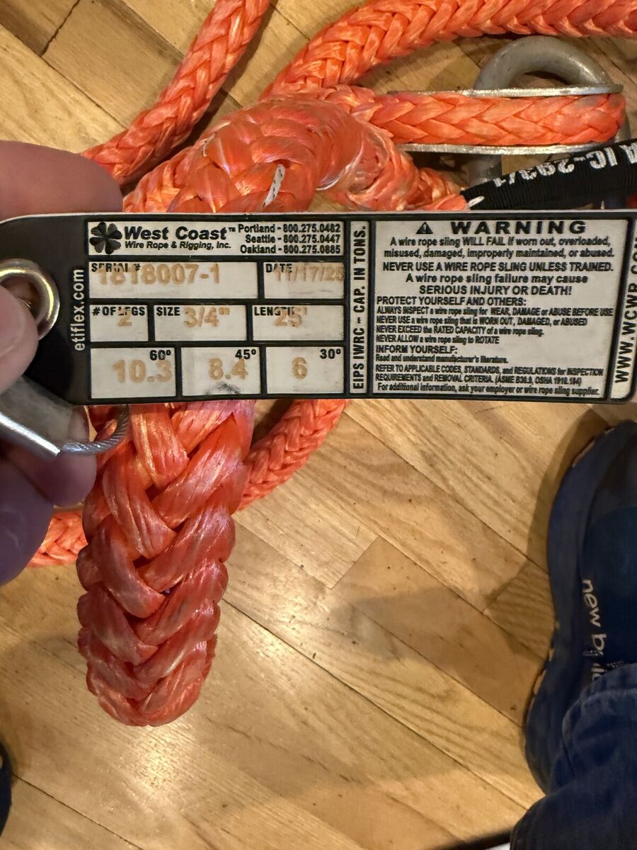 VenmoWest Coast Wire Rope and Rigging 25' Heavy Duty tow strap. Bought this online and it is way too big and heavy duty for my needs. Had no idea how big it was. 25' long. 3/4" diameter with huge hooks. Well over an inch in diameter for the first 4 feet after each hook. Look at the label in the last photo for details from the manufacturer. This tow strap is something a tow truck or other heavy equipment operators would use.