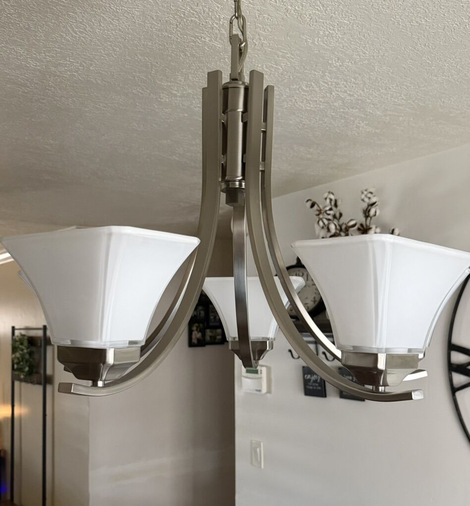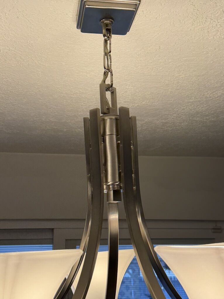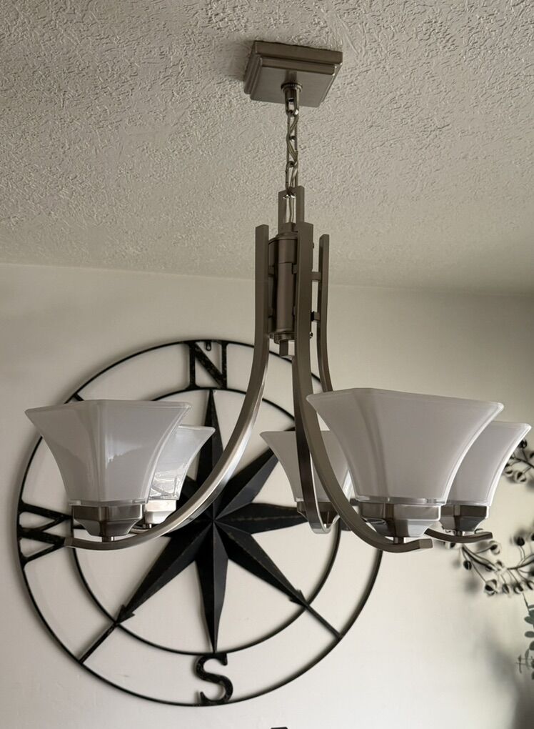 Hanging 5 light brushed nickel fixture, used in dining room. Pictures don’t do it justice, beautiful fixture! $90.00