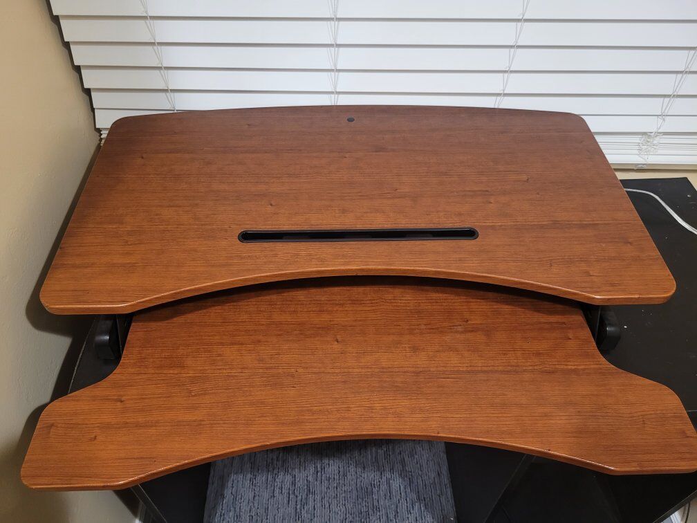 VenmoThis dark walnut standing desk is in perfect shape. My husband used it when he worked from home, but he's got a different job now so we don't need it anymore. Works great, I included a link below to a comparable on Amazon.