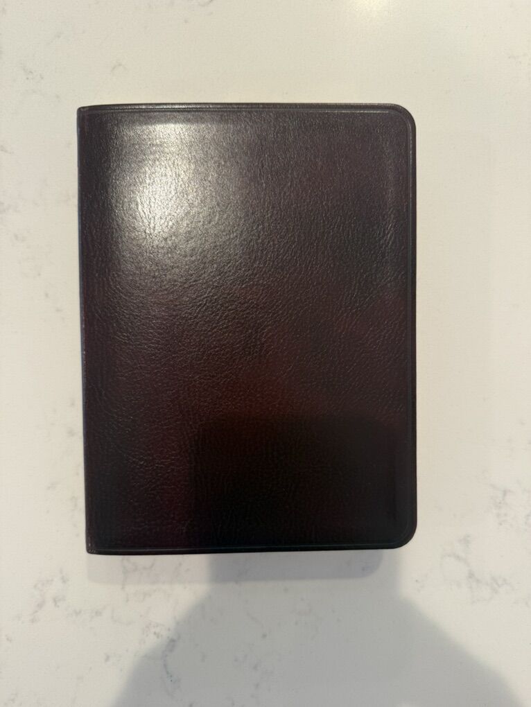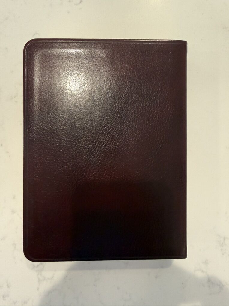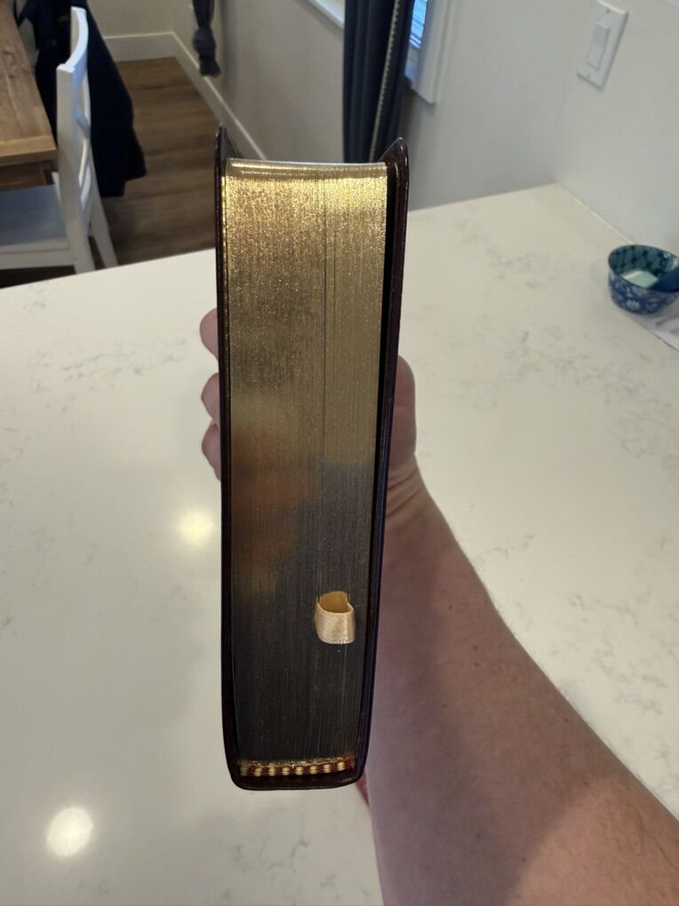 The cover is the same soft leather used on nicer scripture sets. The gilding is in excellent condition. The book has remained in the box it came in except for a handful of occasions.