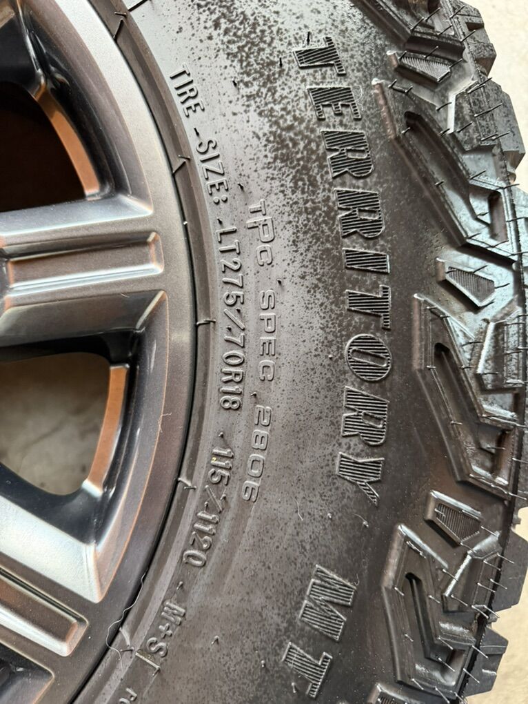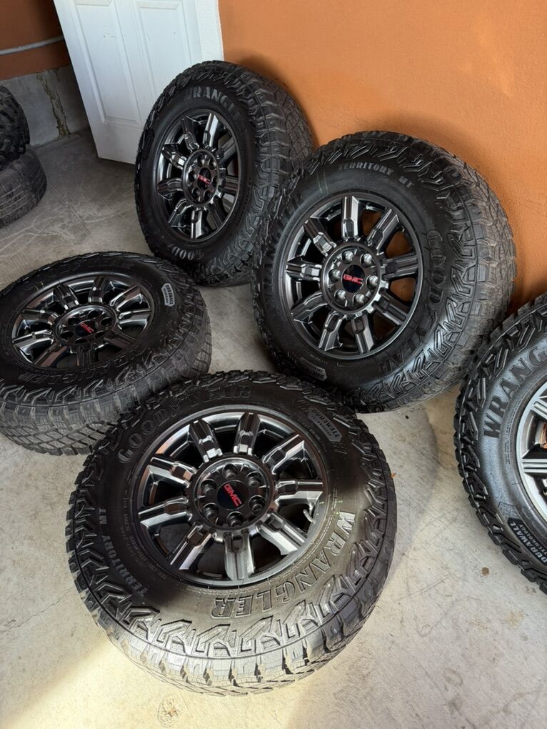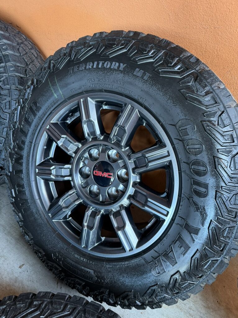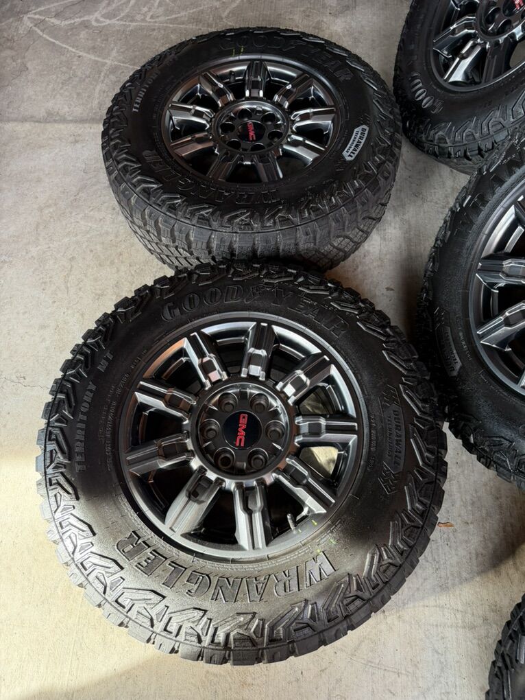 Selling my brand new gmc sierra 1500 wheels and tires only 15 miles on them spare wheel and tire included tires are 275/70r18 Goodyear wrangler territory M/T durawall technology 6x5.5 lug pattern