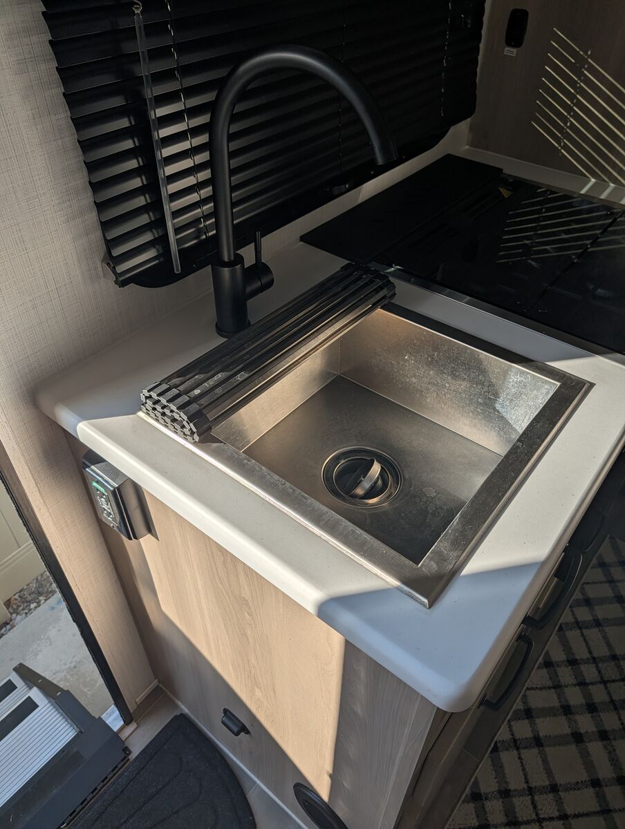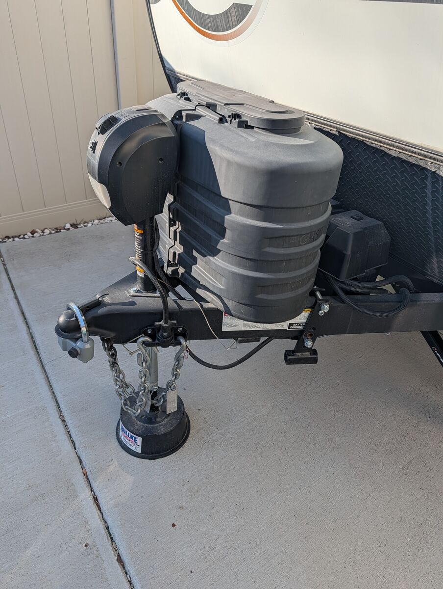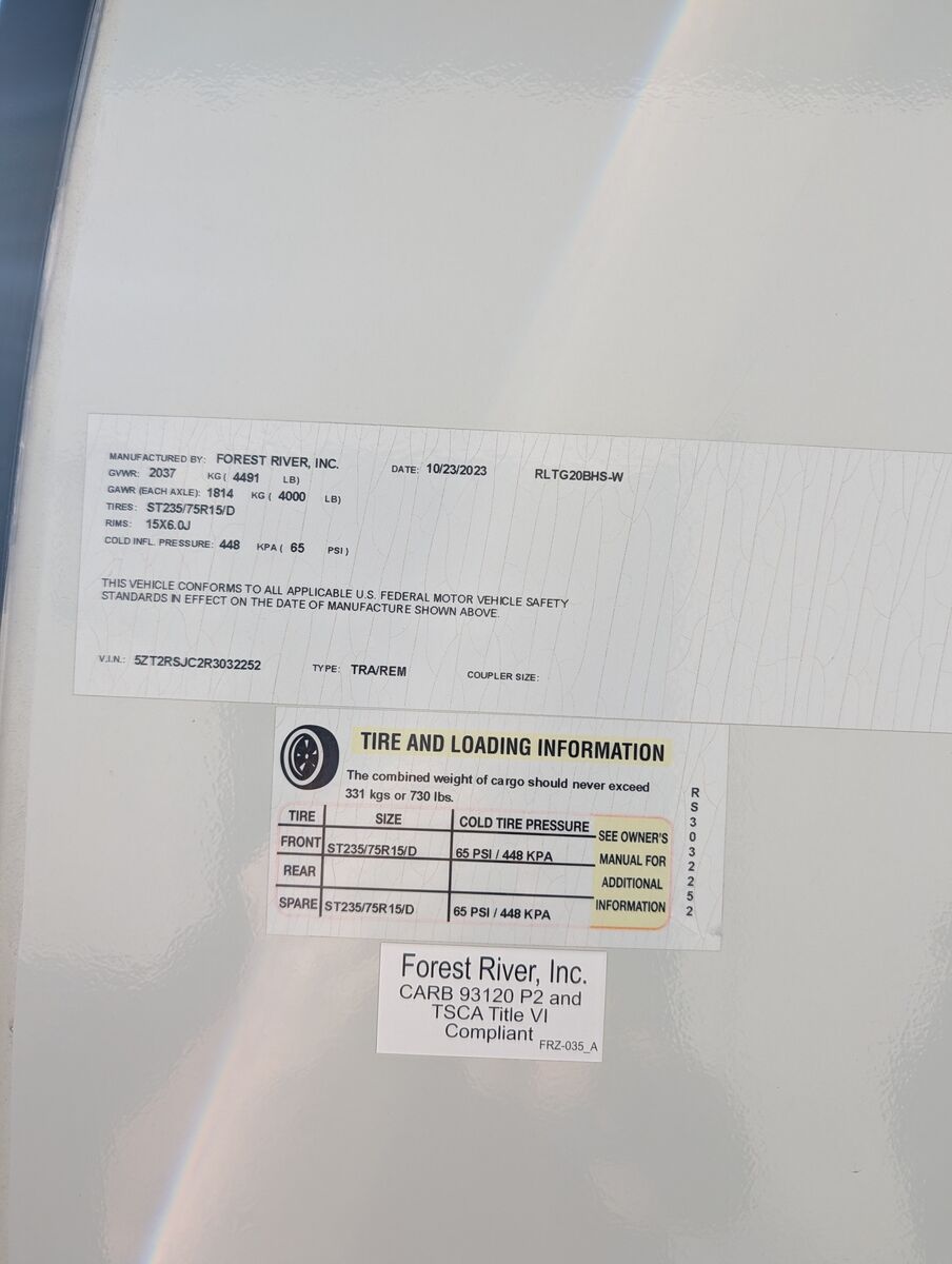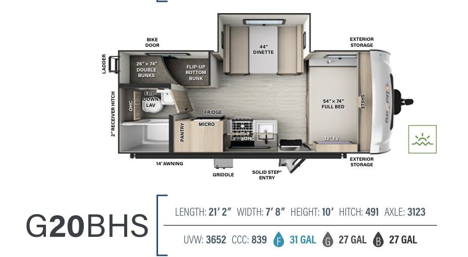 The 2024 Forest River Rockwood Geo Pro G20FBS is a travel trailer with a dry weight of approximately 3,545 lbs, a length of 21 ft 2 in, and a single slide-out. It features holding tanks that each hold around 27-31 gallons. Dimensions and Weight Exterior Length: 21 ft 2 in Exterior Width: 7 ft 8 in (92") Exterior Height: 10 ft Dry Weight: 3,545 lbs Hitch Weight: 398 lbs Gross Vehicle Weight Rating (GVWR): 4,398 lbs Cargo Carrying Capacity: 853 lbs Axle Count: 1 Capacities and Systems Fresh Water Capacity: 31 gal Grey Water Capacity: 27 gal Black Water Capacity: 27 gal Sleeping Capacity: 3 people Furnace BTU: 20,000 BTU AC BTU: 13,500 BTU LP Tank Capacity: 20 lbs (two tanks) Water Heater Type: Gas/Electric Quick Recovery Key Features Slide-out: 1 (72" sofa slide out) Awning: 14 ft power awning Tires: 15" Mud Rover Radial Tires with a lift kit Construction: 6-sided aluminum cage construction with composite wall construction Solar: 200W roof solar panel with an 1800W inverter is standard (an optional Power Package offers more solar/inverter capacity) Appliances: 12V refrigerator, 3-burner cooktop, and a microwave oven