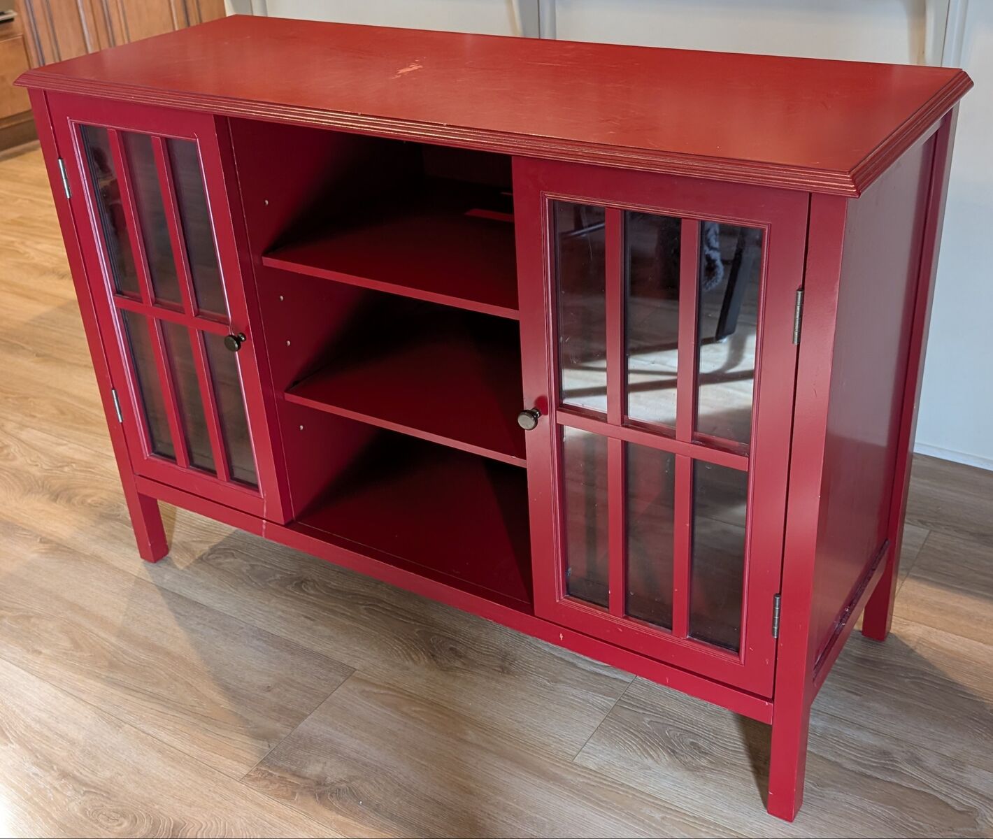 VenmoRed wood and glass cabinet. 42 1/2" wide x 16" deep x 31" high