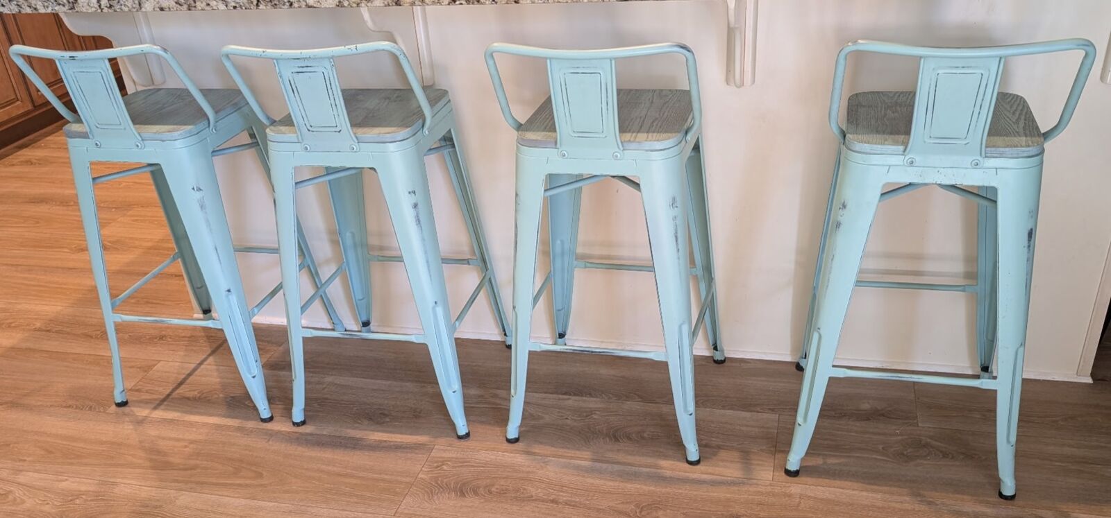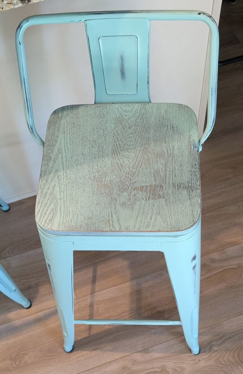 VenmoSet of 4 blue & wood kitchen stools. Distressed look. Seat height 26", seat back 7", 16 1/2" x 16 1/2" (base). Sold as a set only.