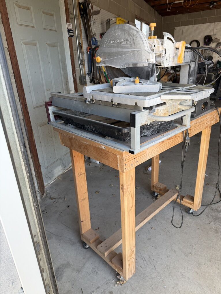 ZelleElectric saw set up with a rolling wooden table. Can’t see the make / model. It is older and dusty but in good condition