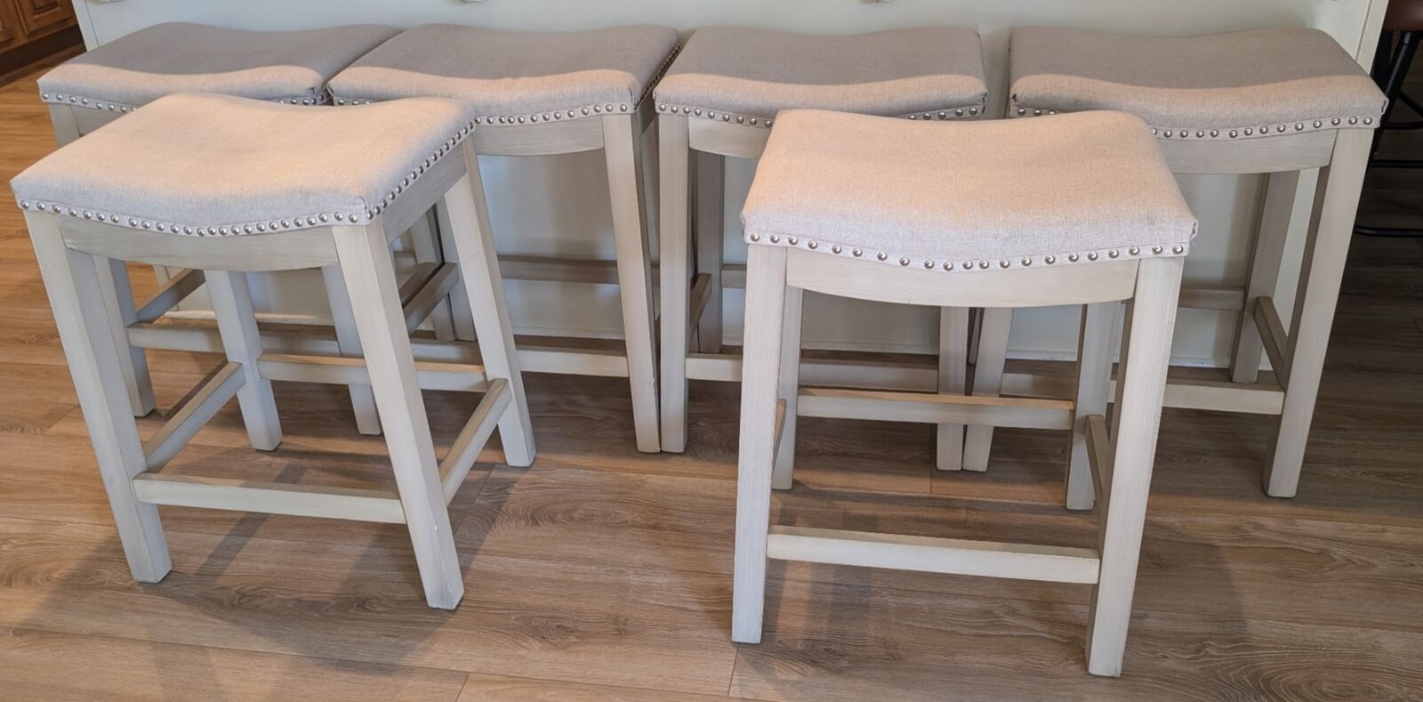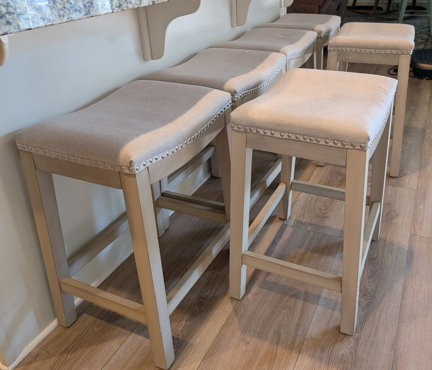 VenmoSet of 4 wood and cloth barstools. Seat height - 24", 14 " deep x 18" wide. Sold as a set only.