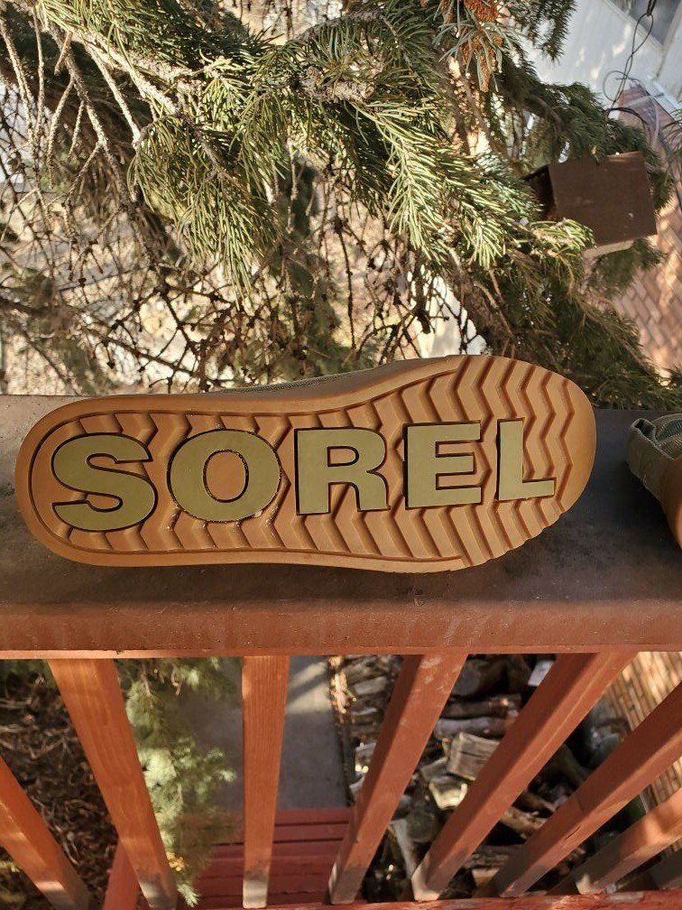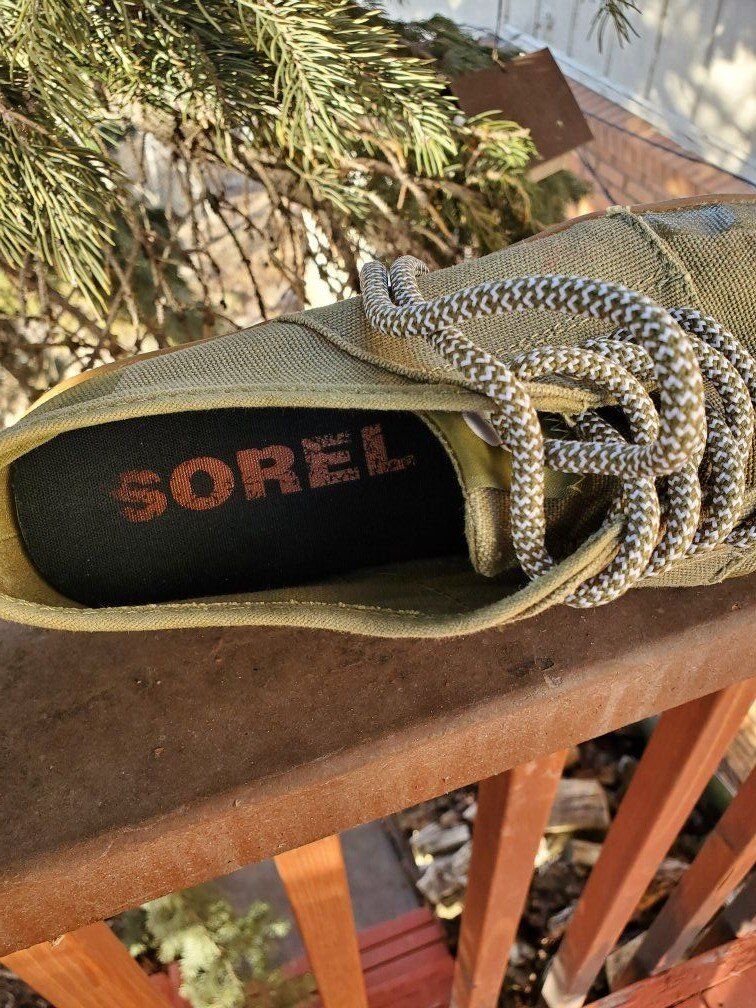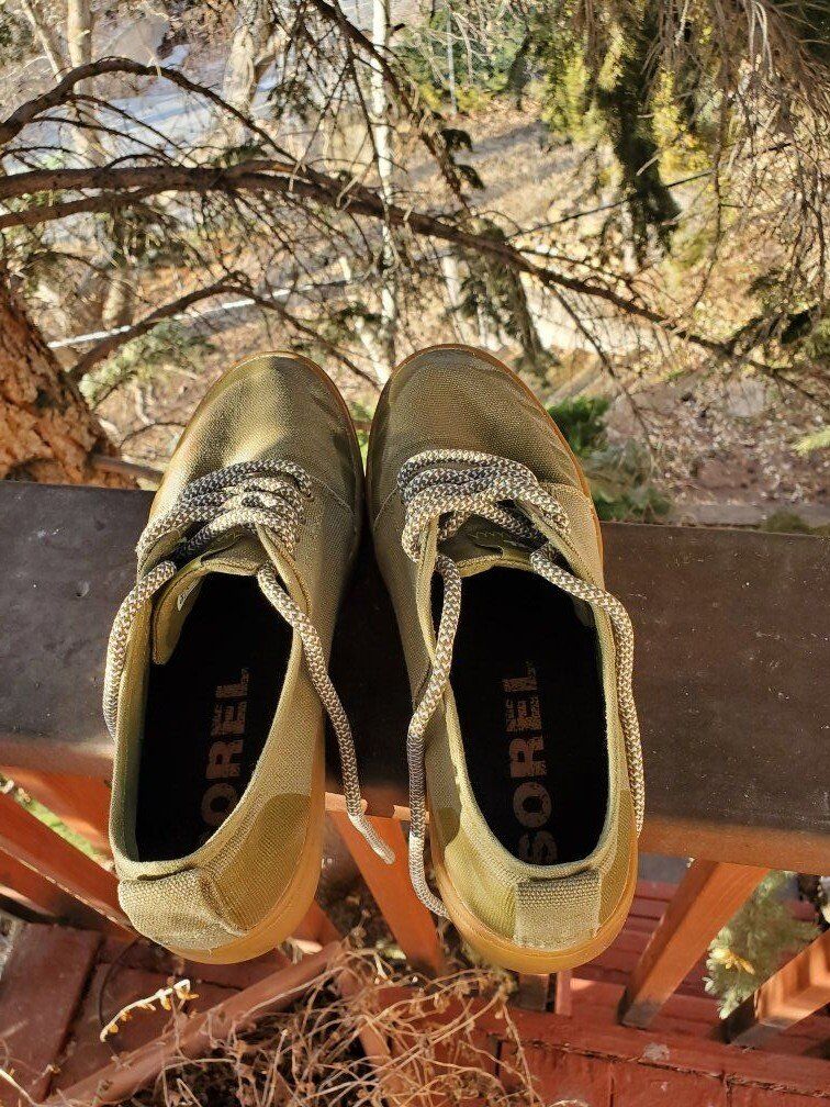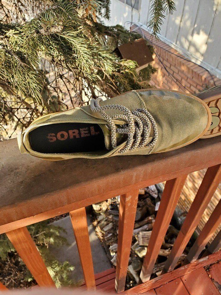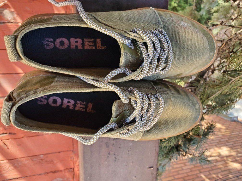 Comfy Sorel oiled canvas sneakers in olive green. Water resistant. Women's size 8.5. Cash only please.