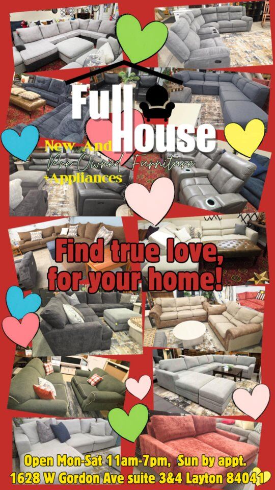 Visit us Mon-Sat 11am-7pm, Sundays by appt. 1628 W Gordon Ave suite 3 & 4, Layton 84041. -Delivery and Haul-Away services Available Check Out Our Sales Going On Now! FB: Full House Pre-Owned Furniture TikTok: Full.House.Preowned