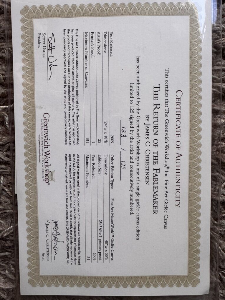 Single cavas edition limited to 125 signed by artist No direct sunlight, stored by wall Non smoking home