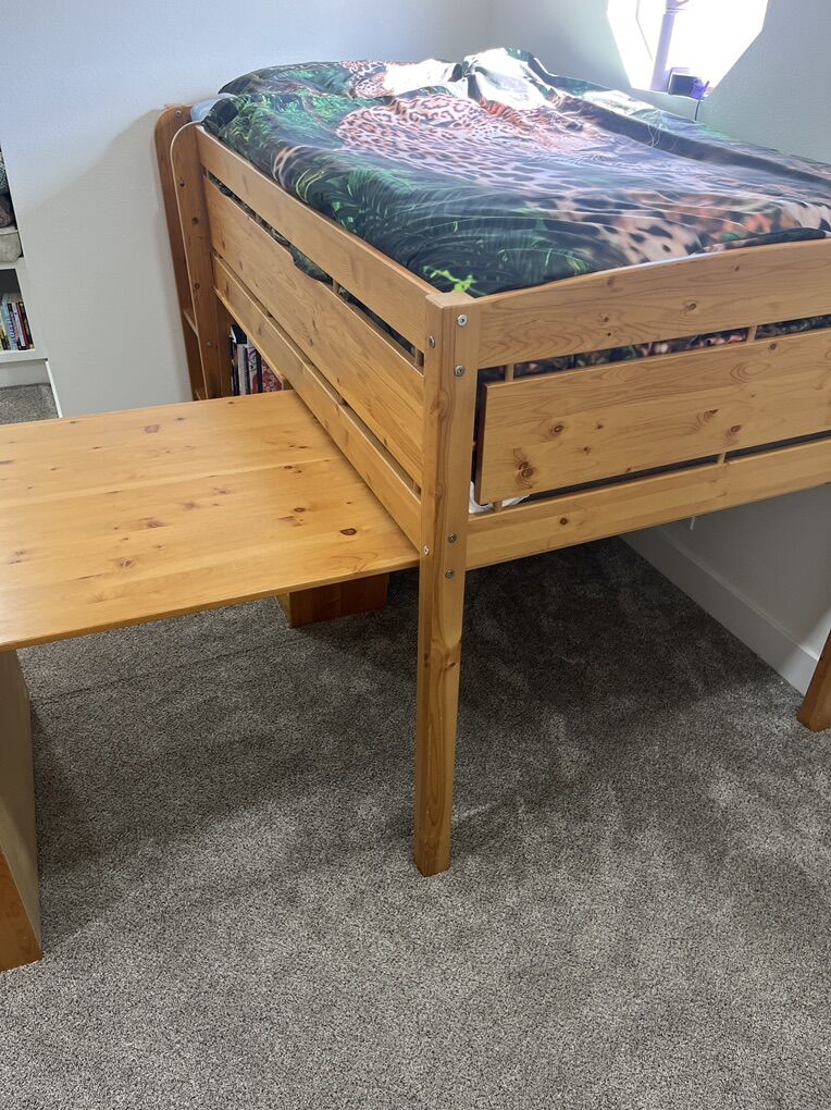 VenmoThis is a solid wood twin size bed with a pull out desk and shelves. It’s a very fun bed for kids, and in great condition. Pet/smoke free home.