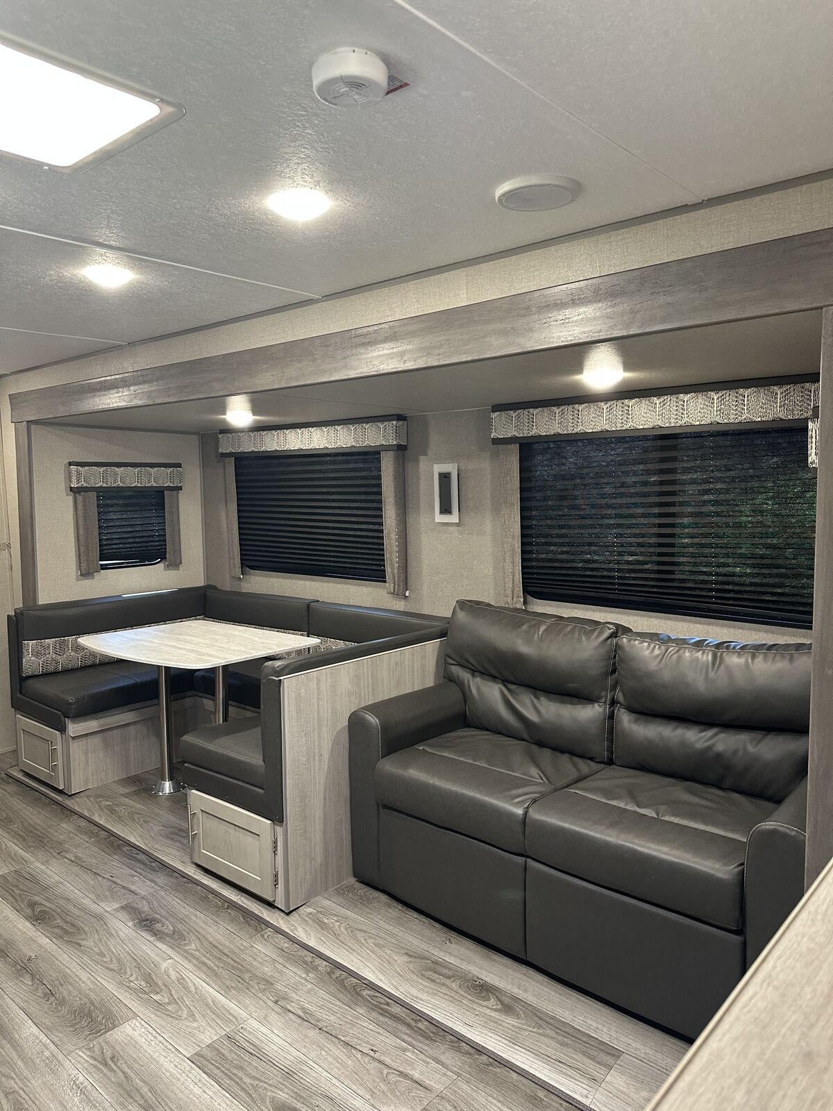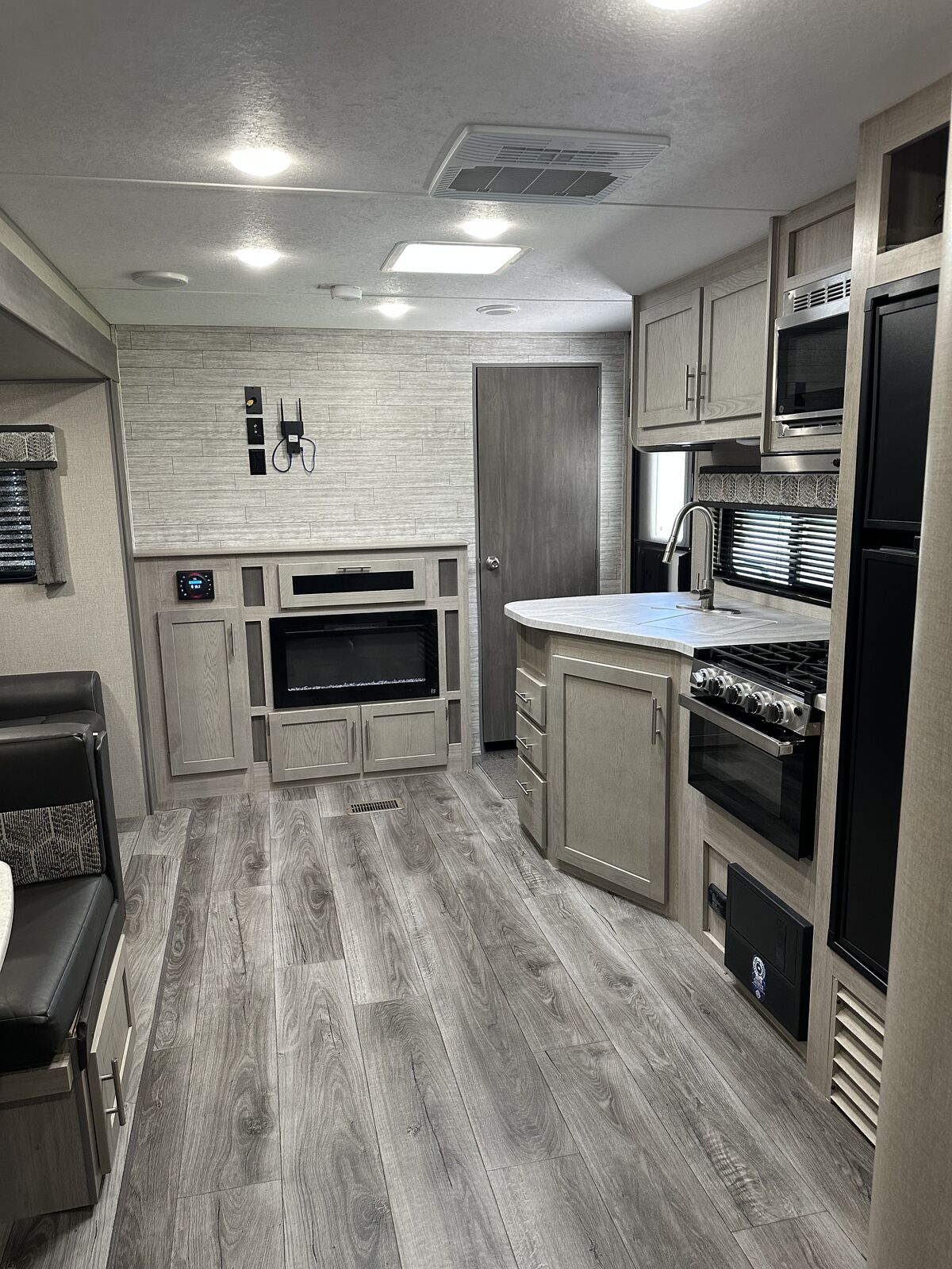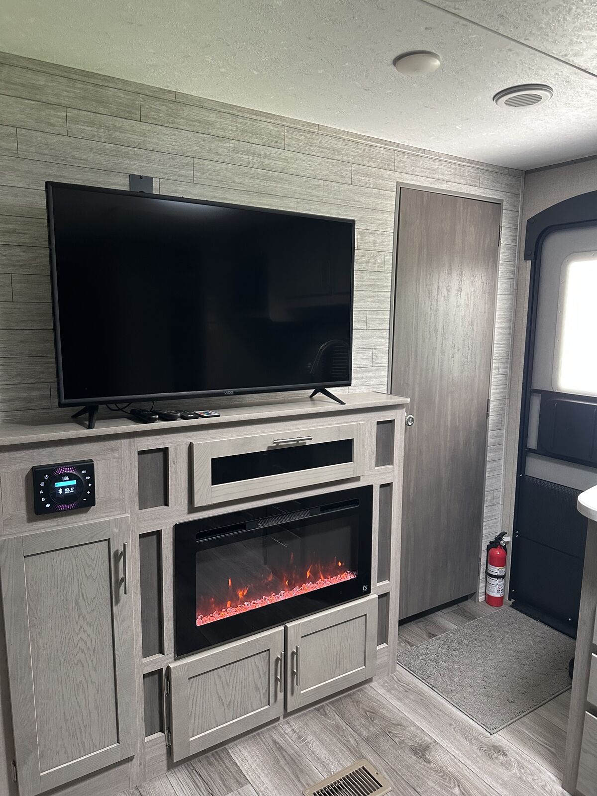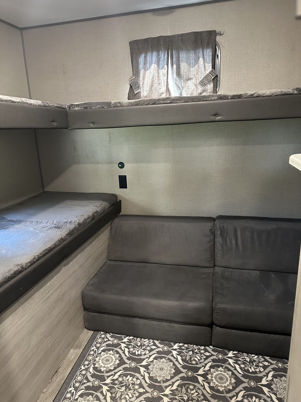 Family-Friendly Vibes: The bunkhouse layout has a private bunkroom for the kids, a comfy king bed for parents, and a U-shaped dinette for family meals or game nights. A 14' slide-out gives you extra space to chill! Outdoor Fun Zone: Cook up tasty meals in the outdoor camper kitchen with a fridge, gas griddle, and storage. Relax under the 18' awning, rinse off with the outdoor shower, or haul gear on the flip-down cargo rack. Cozy & Connected: Jam out with the Premium JBL Audio system, watch movies on the VIZIO 43 4K UHD HDR LED Smart TV*, or cozy up by the electric fireplace. The General Electric Appliance Package and Tri-Fold Sofa add homey comfort, and the WiFi Booster/Router keeps you online. Ready for Anywhere: Power up with a 200W rooftop solar package (30A controller), two 12V 100Ah LiFePO4 lithium batteries (640Wh Grade A Cells), and a Cummins Onan P4500i generator included*. Camp off-grid with ease! Smooth & Easy Travel: Roll on aluminum wheels with a spare tire and carrier, set up with scissor jacks, and connect easily with the stabilizer hitch/bars and Electric Tongue Jack w/Cover. Thermopane windows keep it comfy, and a skylight in the shower adds more head room and a touch of luxury.
