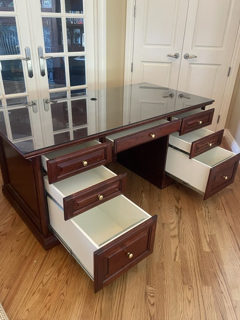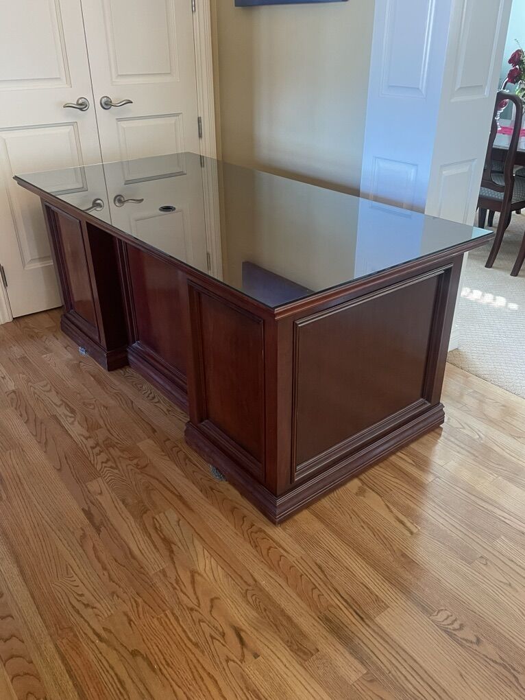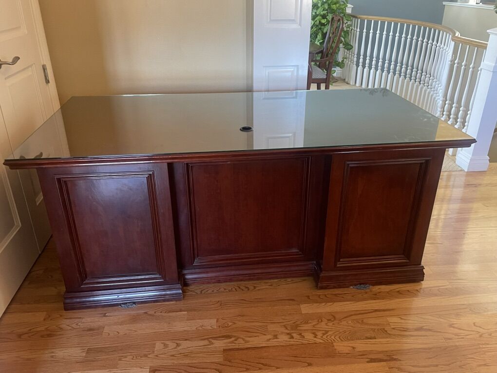 Beautiful Custom Built Cherry 72x36 executive desk, with 2 large filings drawers and additional upper drawers, the glass top has never been removed.
