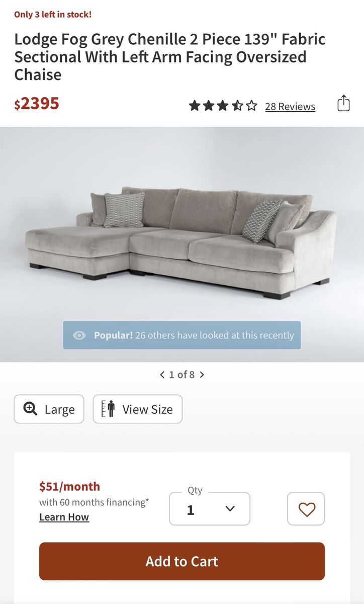 VenmoLodge Fog Grey Chenille 2 Piece 139" Fabric Sectional With Left Arm Facing Oversized Chaise