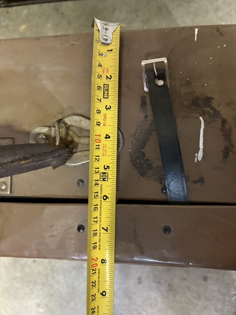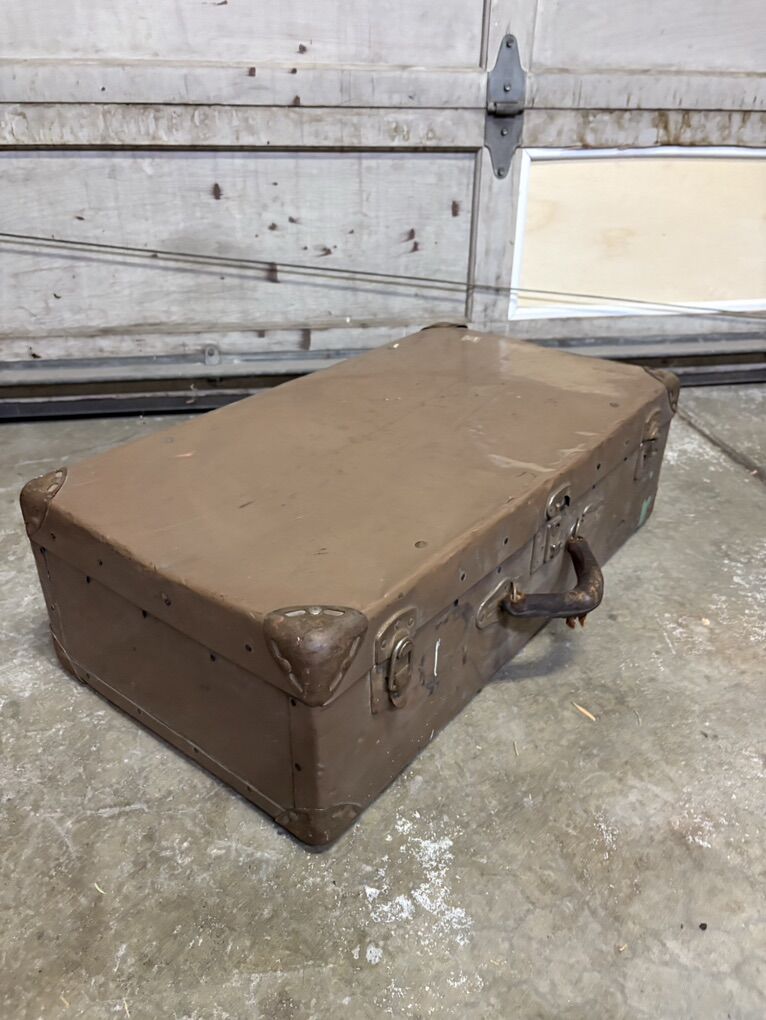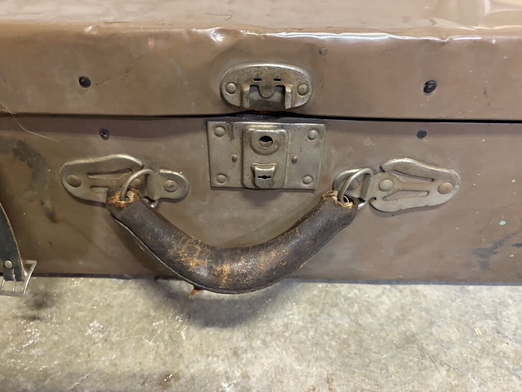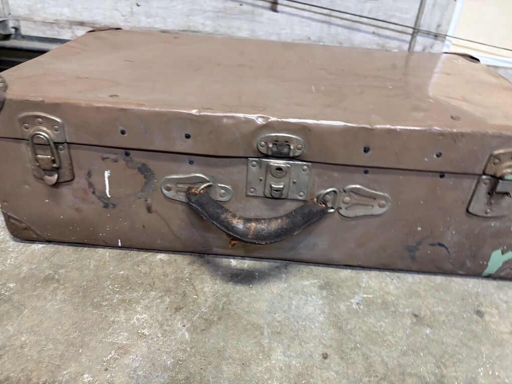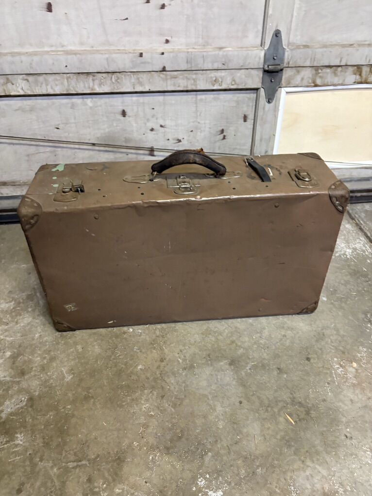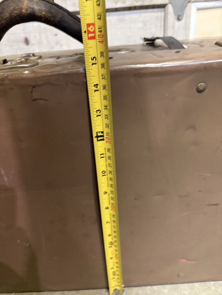 Condition: • Structurally solid • Latches + hardware intact • Leather handle heavily worn • Exterior shows noticeable wear: scratches, dents, paint marks • Interior lining intact with classic vintage pattern