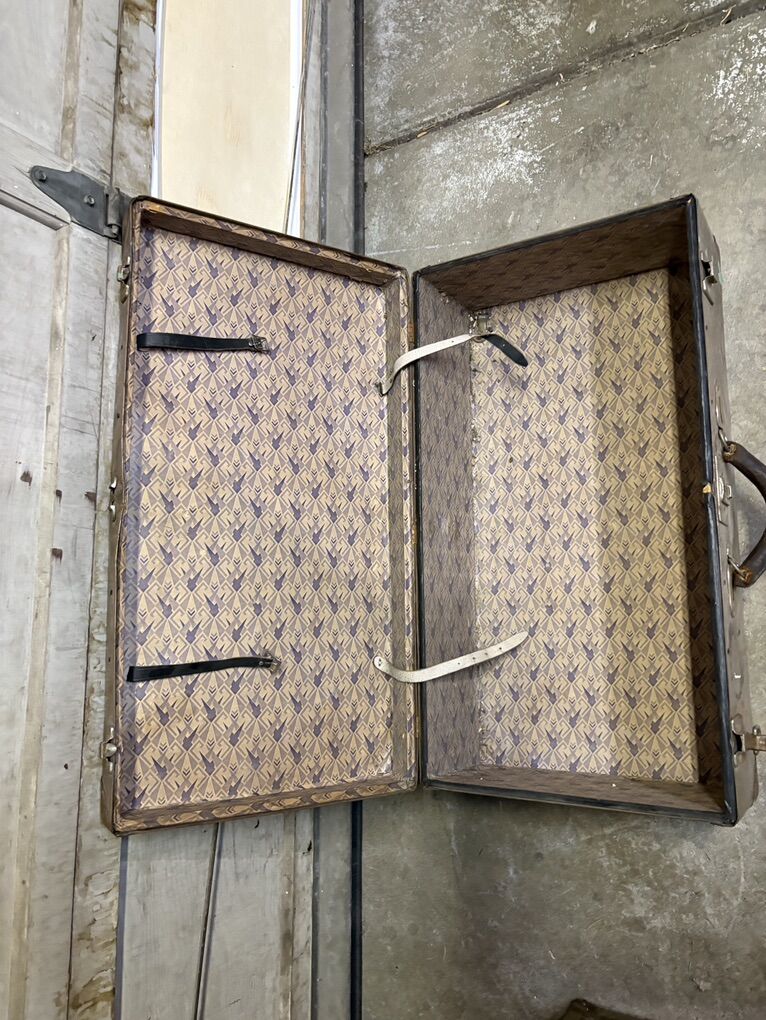 VenmoVintage suitcase trunk with metal hardware and original patterned interior. Great for décor, display, props, or a restoration project.
