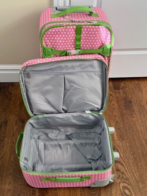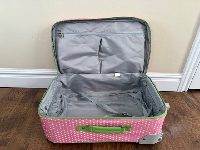 VenmoAdorable Pottery Barn Kids Mackenzie Rolling Luggage in a charming pink and white polka dot design with green trim. Perfect for young travelers, these suitcases feature a durable construction, easy-to-roll wheels, and sturdy handles for effortless transport.
