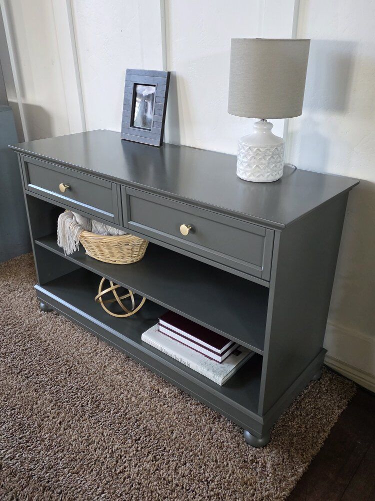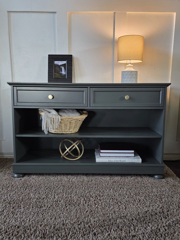 VenmoBeautiful custom-painted console table finished in Benjamin Moore Advance "Ashwood Moss" Features two smooth-glide drawers with modern hardware and two open shelves—perfect for an entryway, living room/sofa table, or TV console. Dimensions: 48” wide × 30” tall × 18” deep