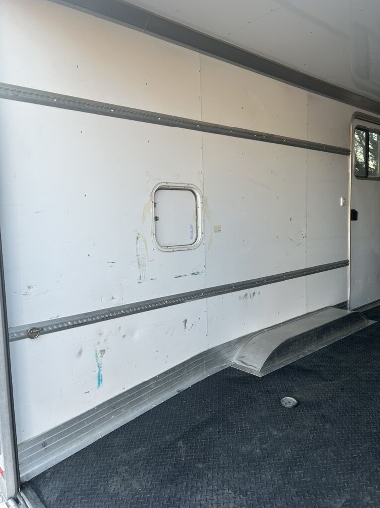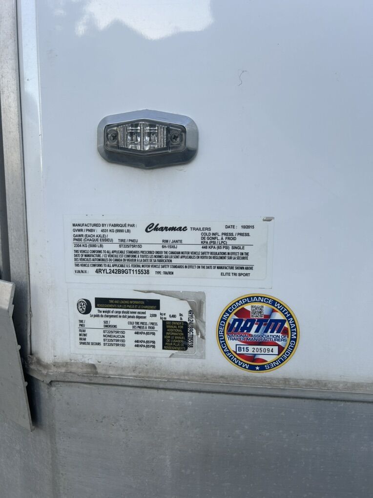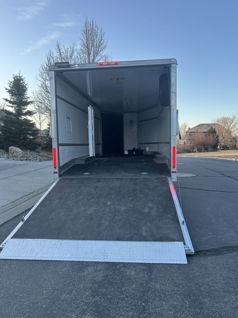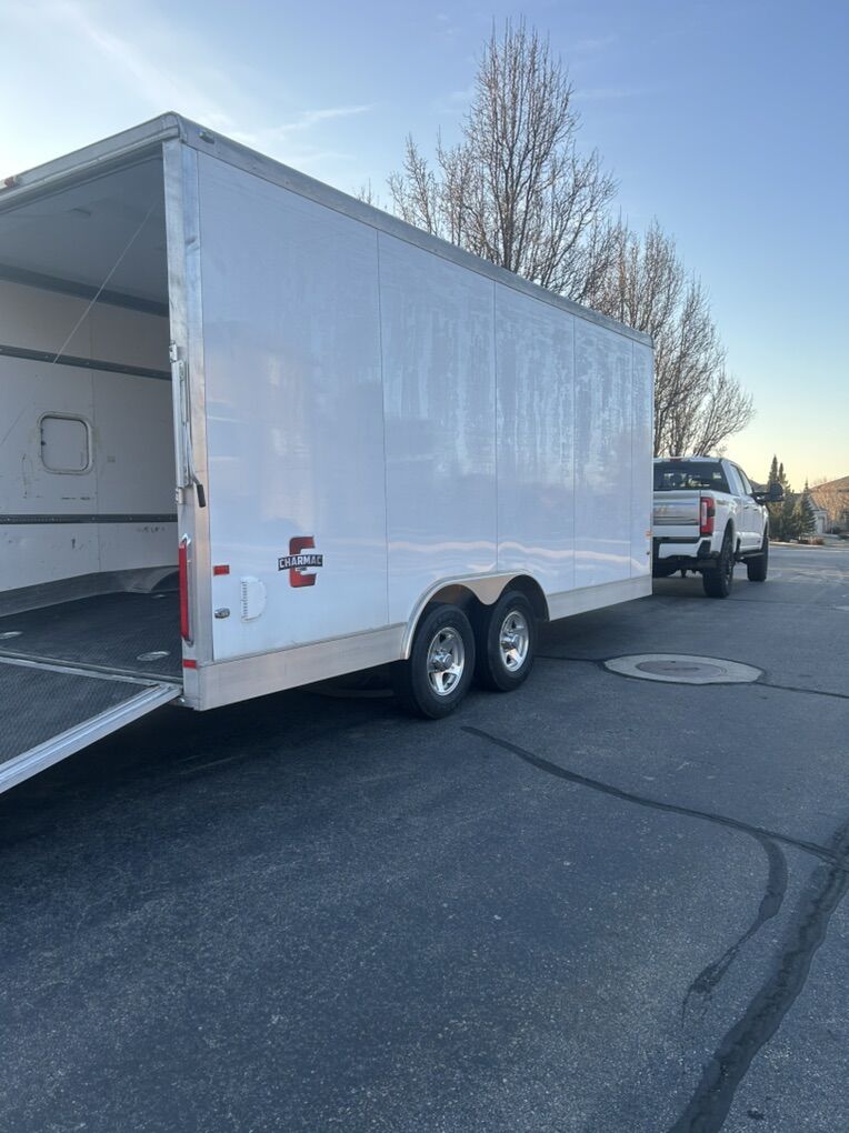 2015 charmac tri-sport elite double axel 24 ft with 102’x24’-5200# torsion axels. In great condition, all aluminum walls,roof and frame. Comes with interior tie down racks with rings, all new tires (oct2024including the spare) hydraulic tongue jack (2025) new battery (2025) and has always been maintained and stored inside. Has some upgrades on it like 2 manual roof vents, diamond plate rubber floors, additional height option, window in man door, extra floor tie down locations, pull through ramp, backup/loading light for both ramps, exterior sheeting, 15w 100v package, additional interior lighting and aluminum step for the the door. Message me if you have any further questions! Shoot me an offer!