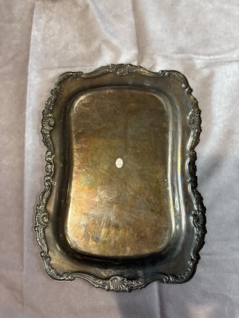 VenmoVintage silverplate serving set: an ornate rectangular tray and an oval F.B. Rogers Silver Co. bowl (original label still attached). Great for décor, displays, holiday styling, or restoration.