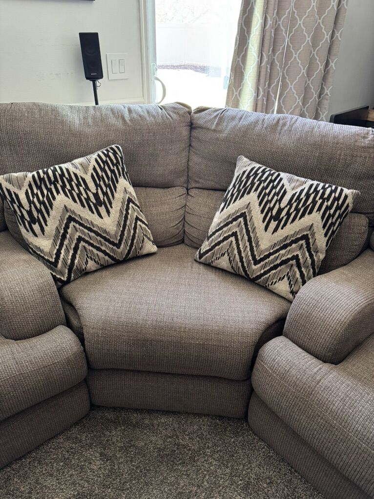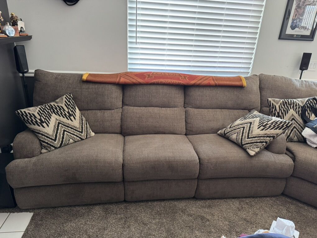 VenmoSelling a used but in great and clean condition sectional couch. The couch part has hardly been sat on and shows no signs of wear. The loveseat was the most sat on and has little wear on headrest and a small hole that was sewn up. Other than the little wear it’s been a great sectional. Looking to downsize. Has 4 working recliners. Asking 1,100 OBO