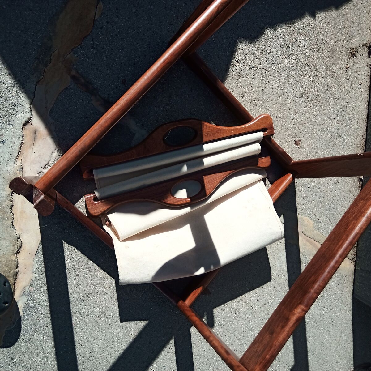 In very good condition, the wood has no scratches or dings, the canvas has a couple of very small spots/stains but otherwise is clean and has no rips or tears.