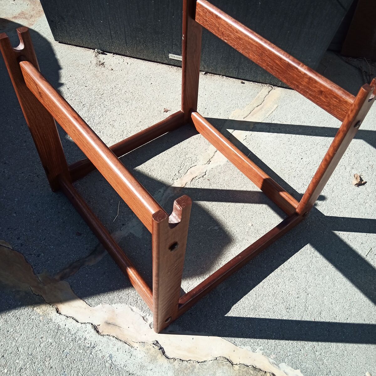 Danish Modern/Mid Century teak log holder with a canvas carrier with sculpted handles that lifts away from the wooden frame.