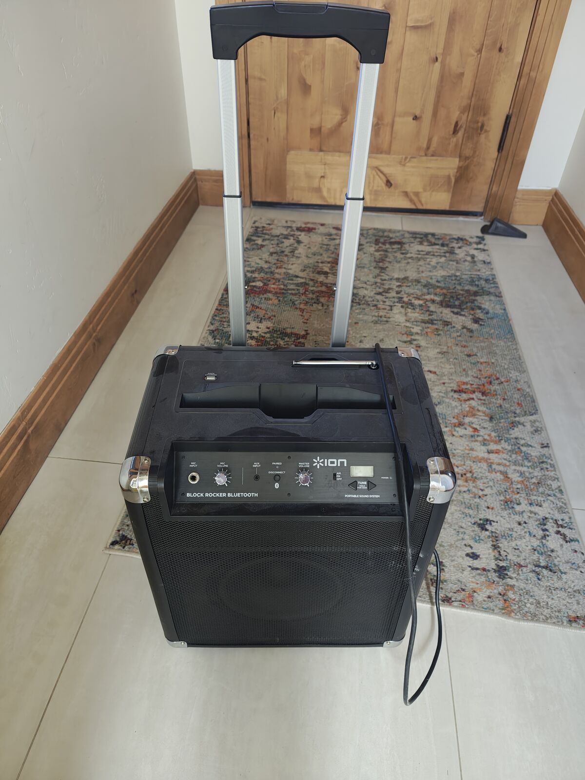 Venmohe ION Block Rocker is a portable, rechargeable Bluetooth party speaker delivering 50-220W of sound, featuring FM radio, microphone input, wheels, and a telescoping handle for transport. Key models offer 35-90 hours of battery life, NFC pairing, USB charging for devices, and "Boom" bass boost. It is designed for outdoor use and connects via Bluetooth, AUX, or Wireless Stereo-Link. Pick up only Park City or Clearfield