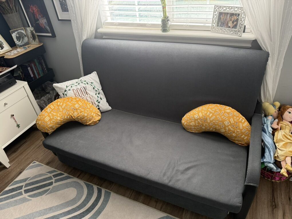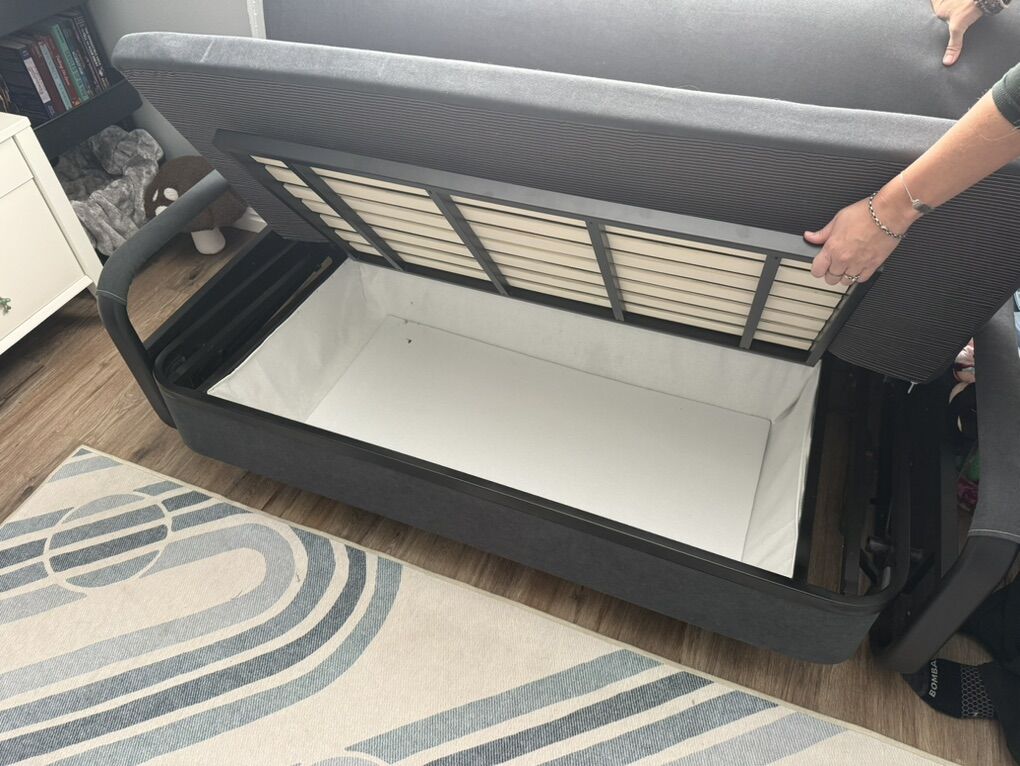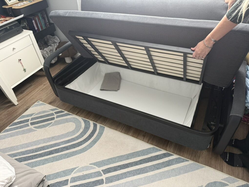 ApplePayLove seat couch sofa Fold out bed Dark grey 59 inch wide Full size foam mattress Futon Compact folding bed Storage for bedding Piaqia brand